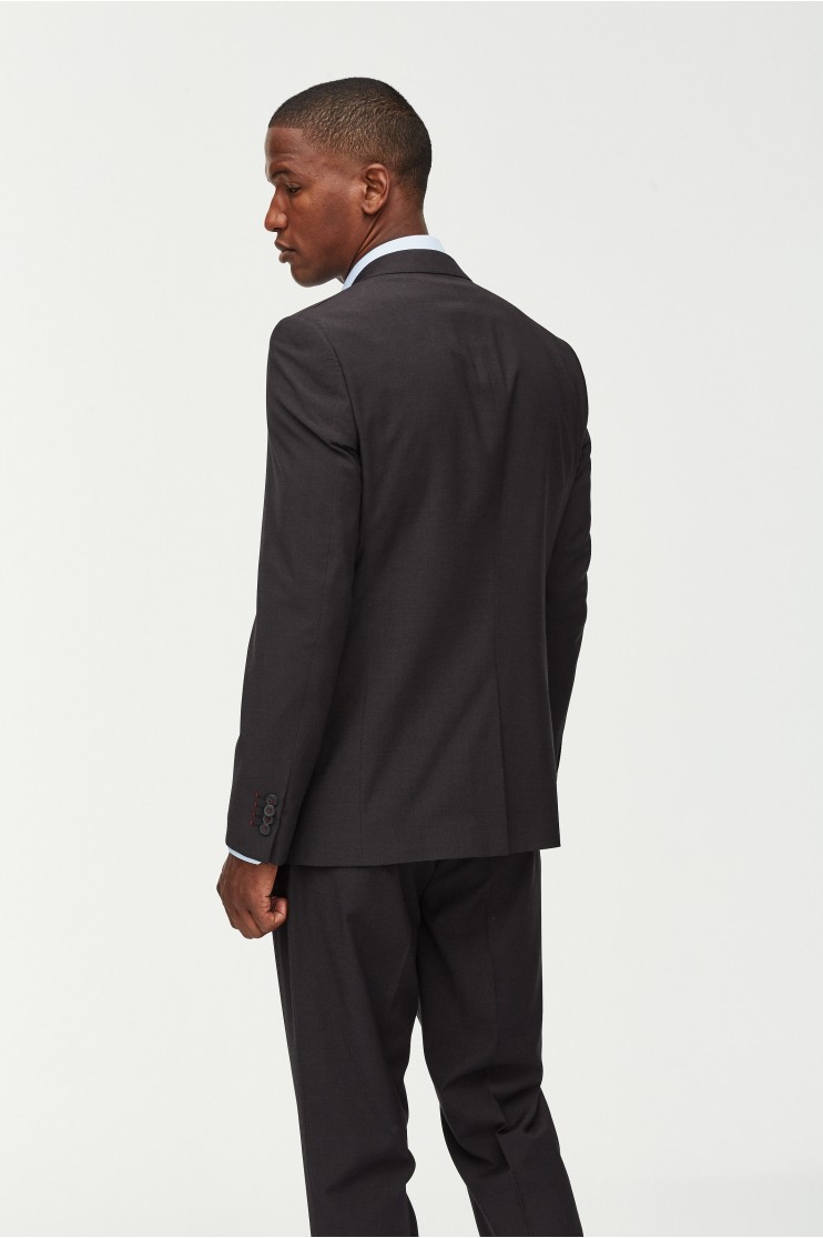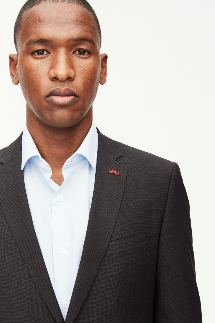 Traje confeccionada en poliéster/ viscosa de gran calidad y confort. Americana con bolsillos laterales, bolsillo a la altura del pecho con detalle .Solapa de muesca y ojal donde esta situado el pin de nuestro bigote. Cierre con dos botones. Manga larga rematada con cuatro botones. Dos aberturas en la parte trasera de la americana.