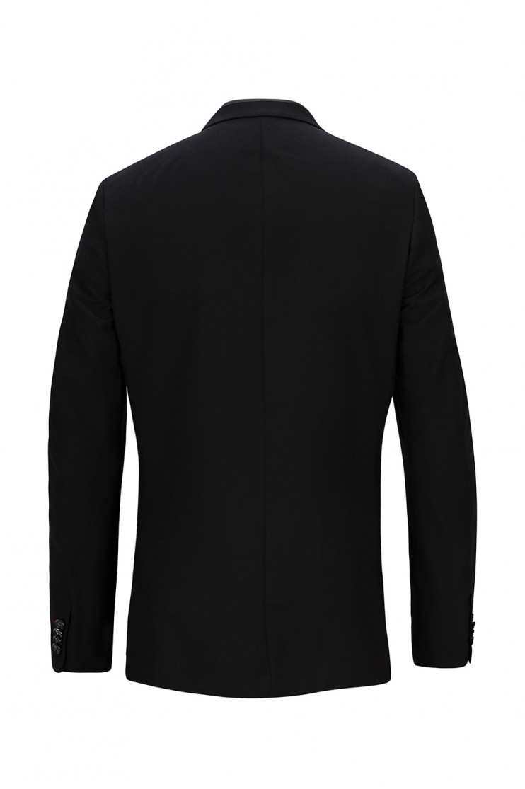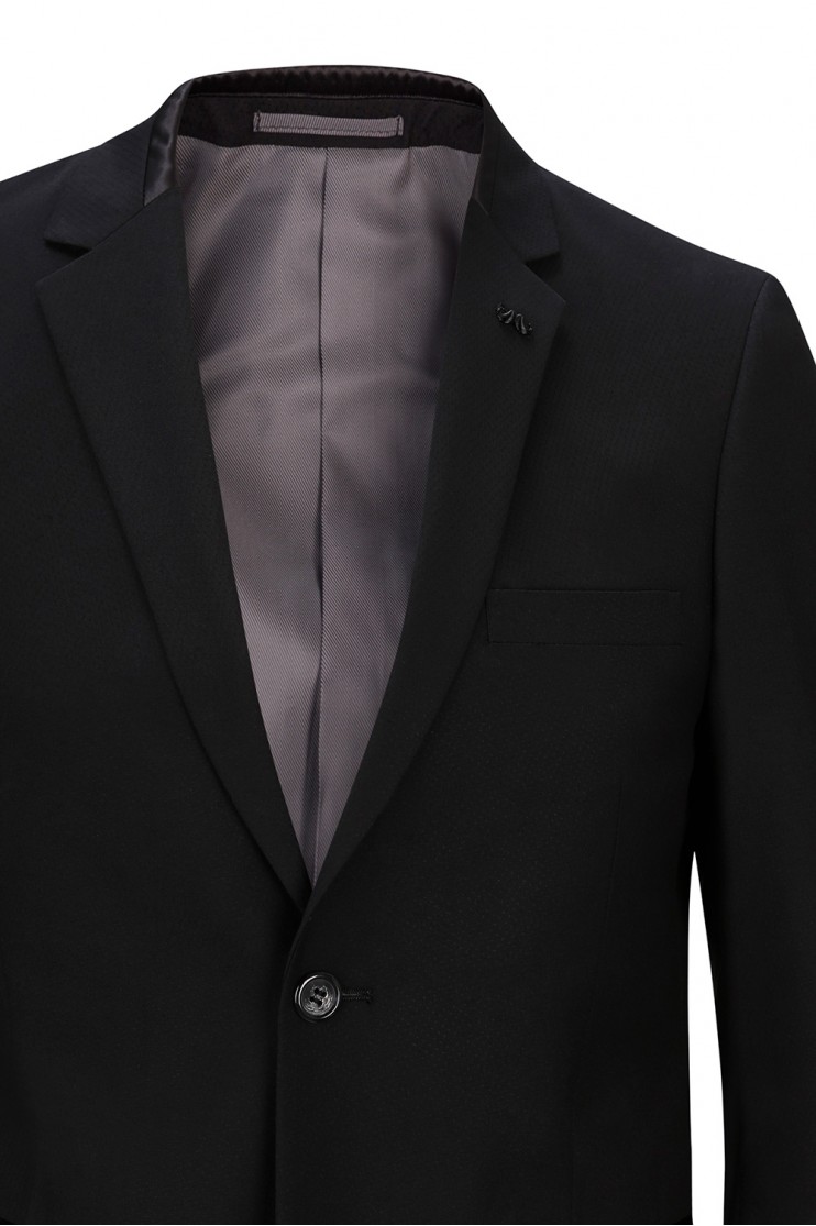 Traje ligeramente entallado en saten. Manga larga con puños abotonados, bolsillos frontales con solapa y cierre de dos botones. Solapa estrecha. Emblema de la firma en ojal.