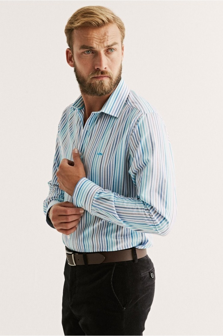 Camisa de rayas. Corte Slim Fit con pinzas en la espalda. Cuello vestir pequeño, cierre mediante botonadura frontal con botones cosidos en ancla, detalle de tapeta con doble abotonadura. Bordado de nuestro bigote en el centro del pecho.