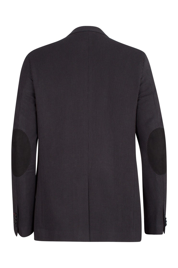 Chaqueta tipo blazer de estilo informal y tejido puntillé. Bolsillos frontales con solapa y de ribete en el pecho, manga larga con puños abotonados, coderas en contraste y cierre de dos botones.