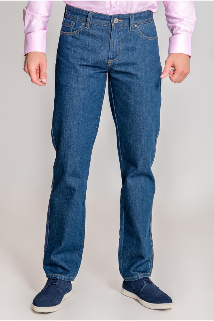 Pantalón vaquero confeccionado en tejido de algodón confort de corte regular. Cuenta con un cierre mediante cremallera y botón contrastado. Presenta cinco bolsillos y trabillas para el cinturón.