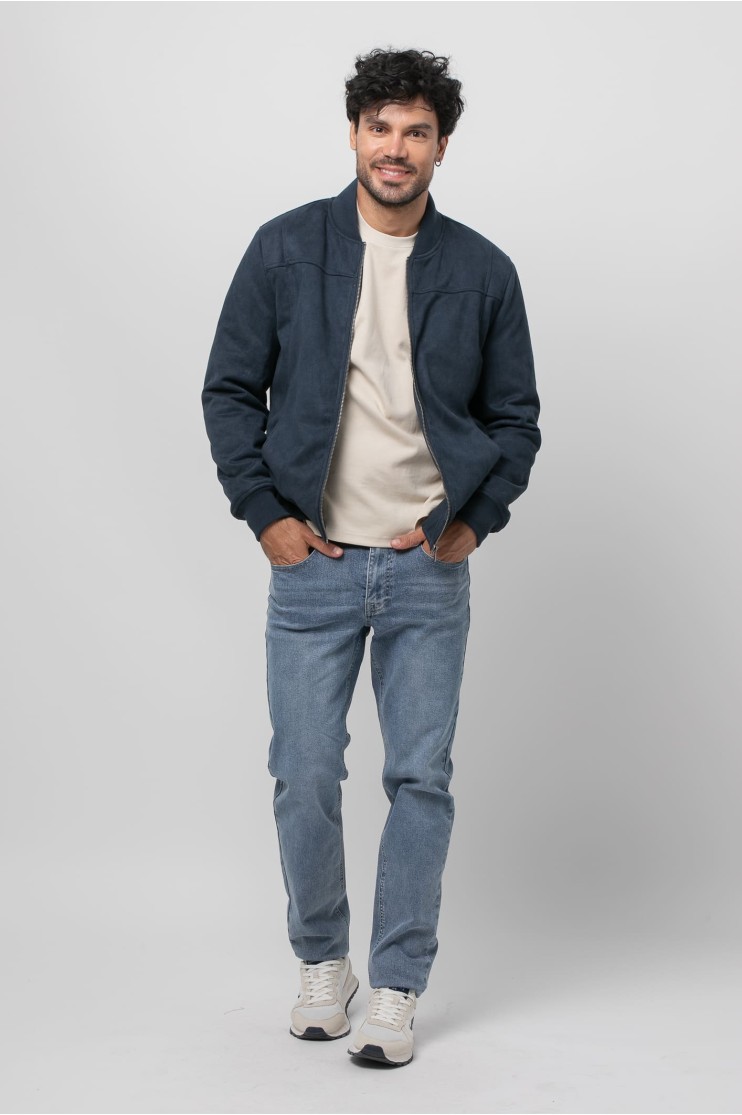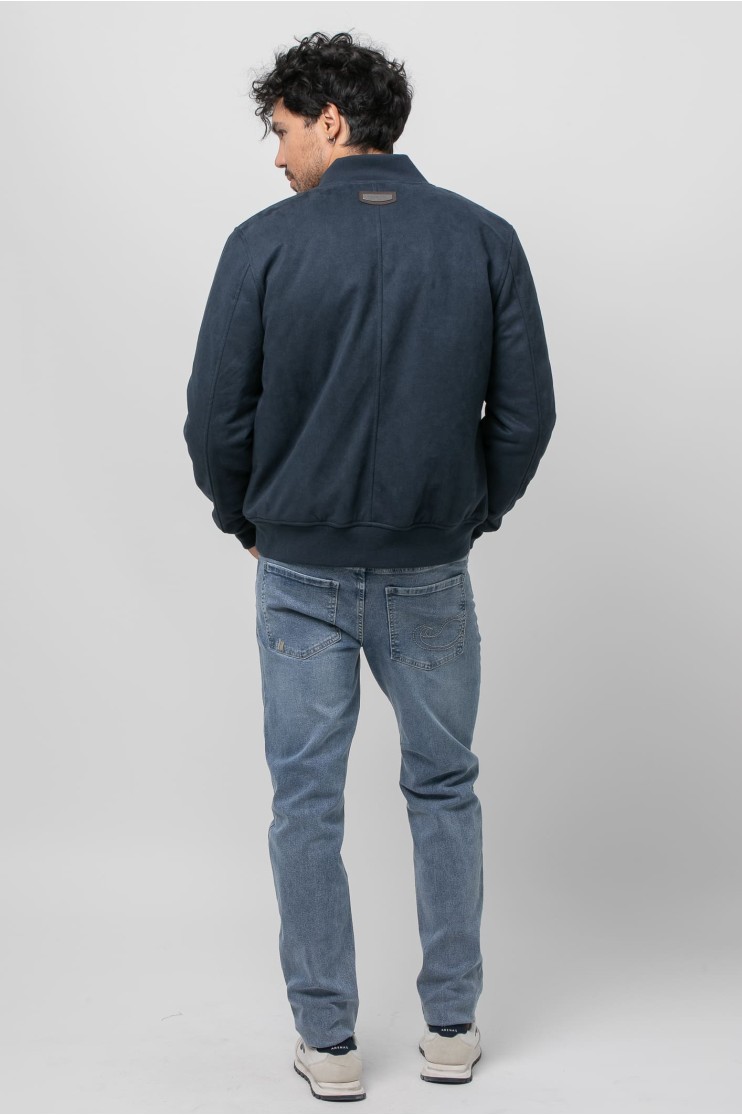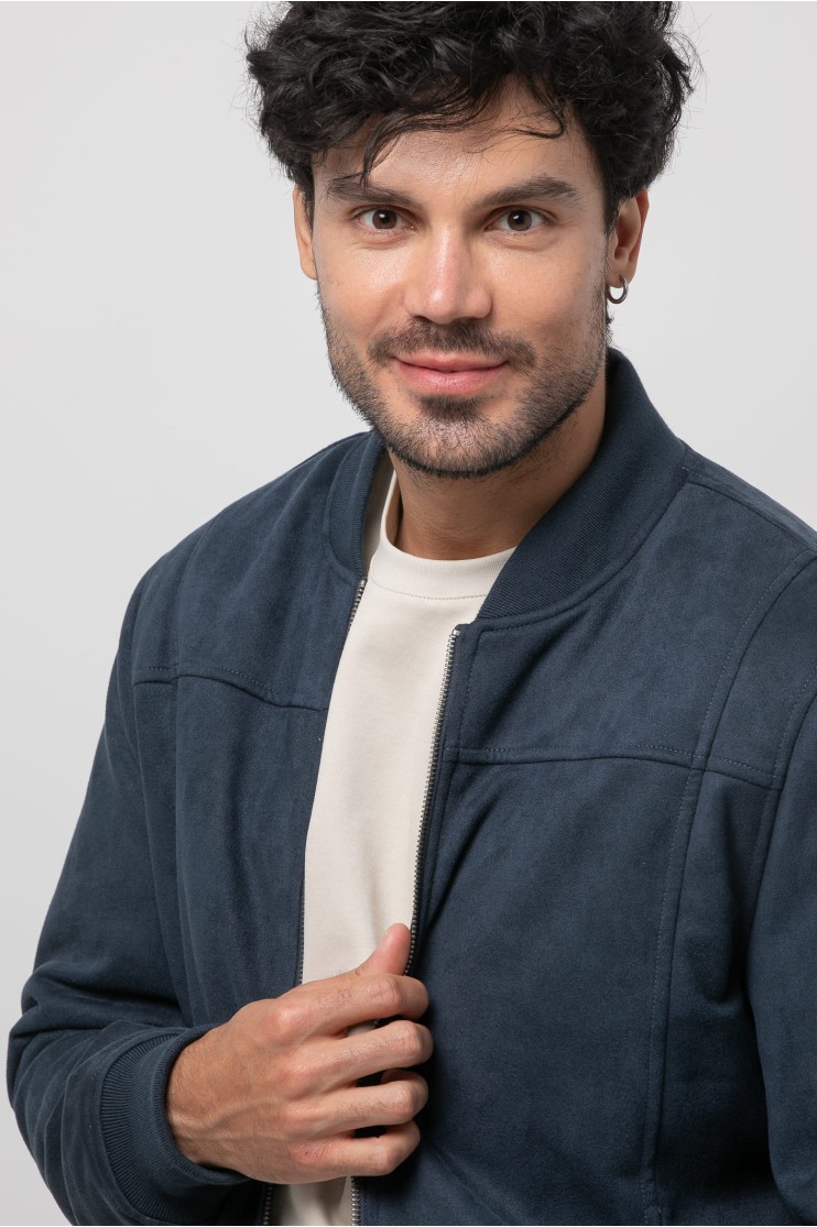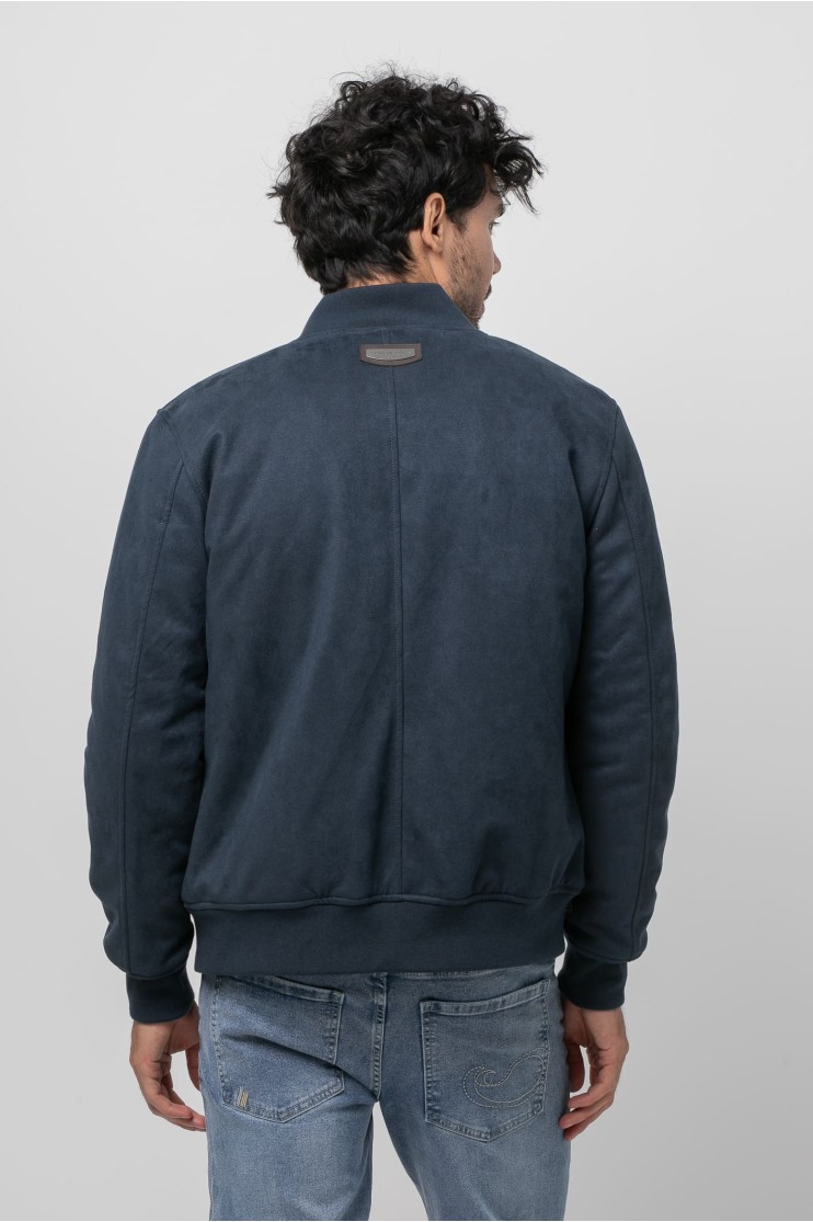 Cazadora tipo bomber de Antelina con cuello redondo y manga larga. Dos bolsillos frontales y forro con bolsillo interior. Cierre frontal con cremallera y acabados elásticos en rib con bandas al tono.