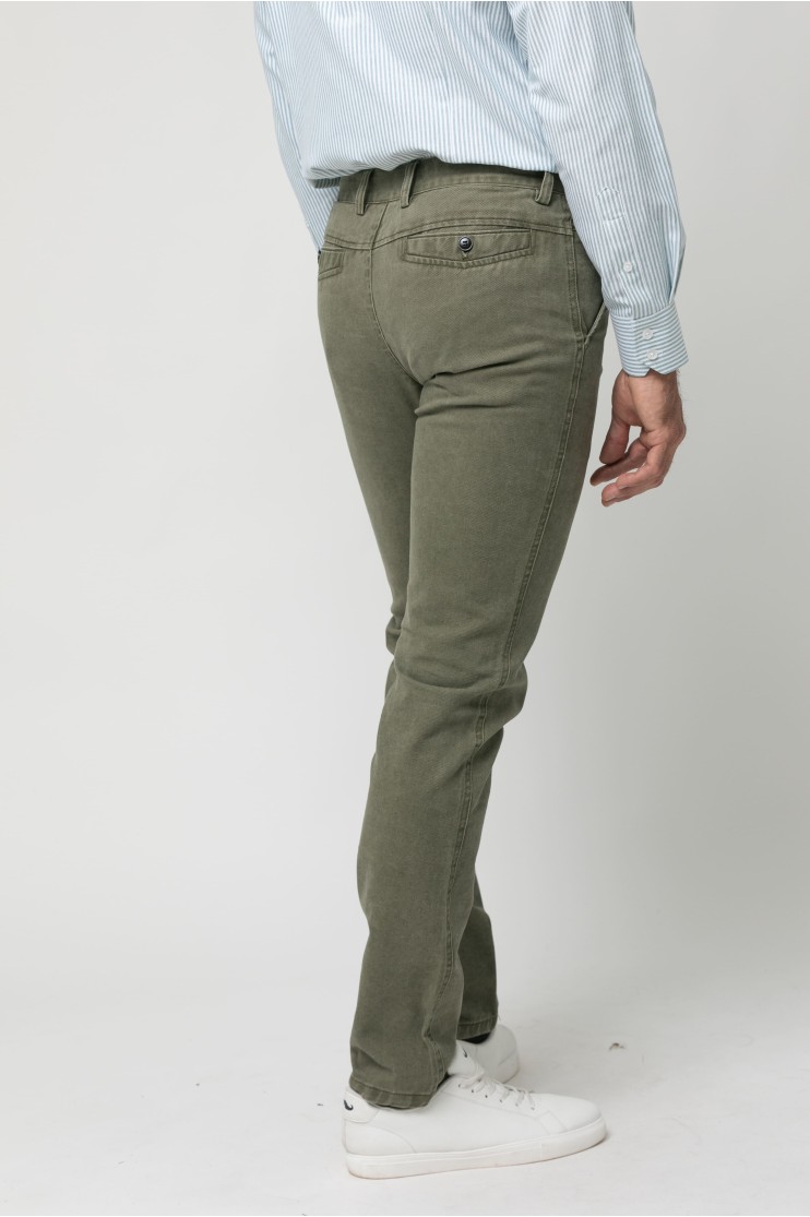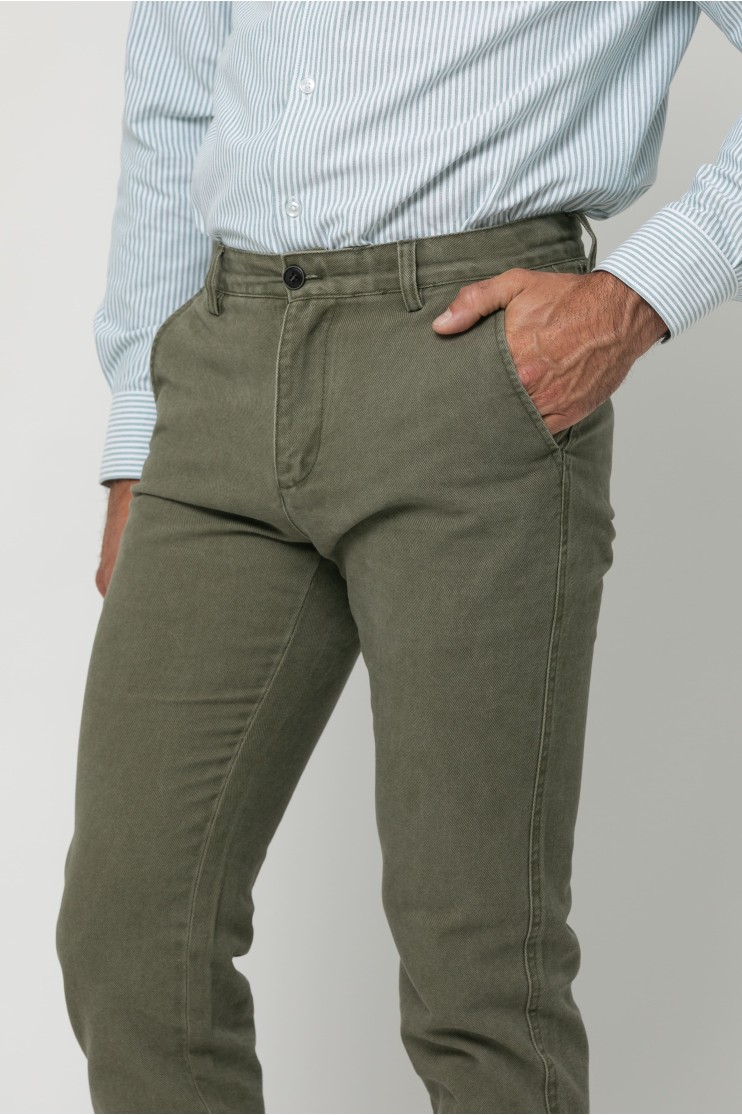 Slim fit. Tejido de 100% algodón con dibujo de sarga. Trabillas para cinturón. Cierre de cremallera y botón. Cinco bolsillos. Dos bolsillos laterales. Dos bolsillos de vivo en la parte posterior con botón.