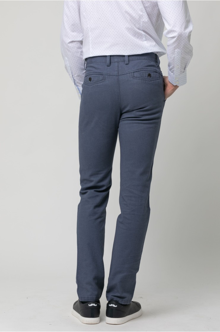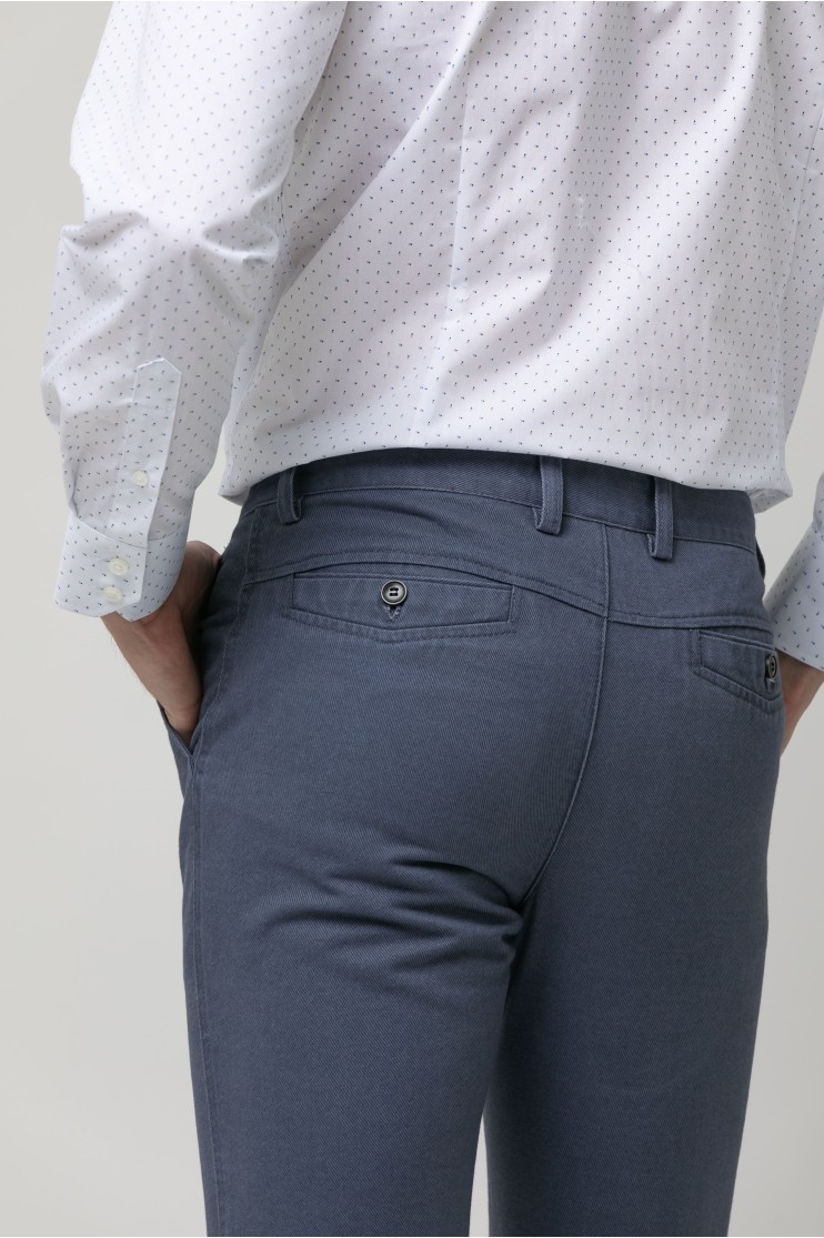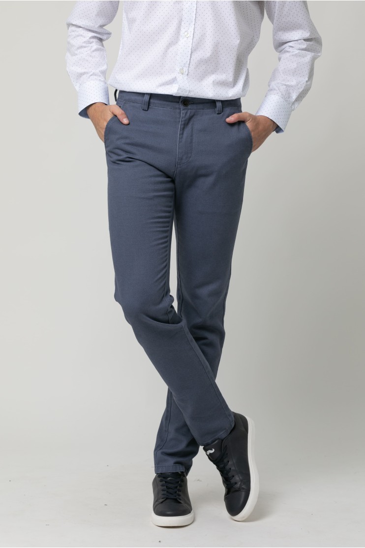 Slim fit. Tejido de 100% algodón con dibujo de sarga. Trabillas para cinturón. Cierre de cremallera y botón. Cinco bolsillos. Dos bolsillos laterales. Dos bolsillos de vivo en la parte posterior con botón.