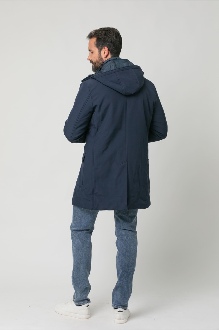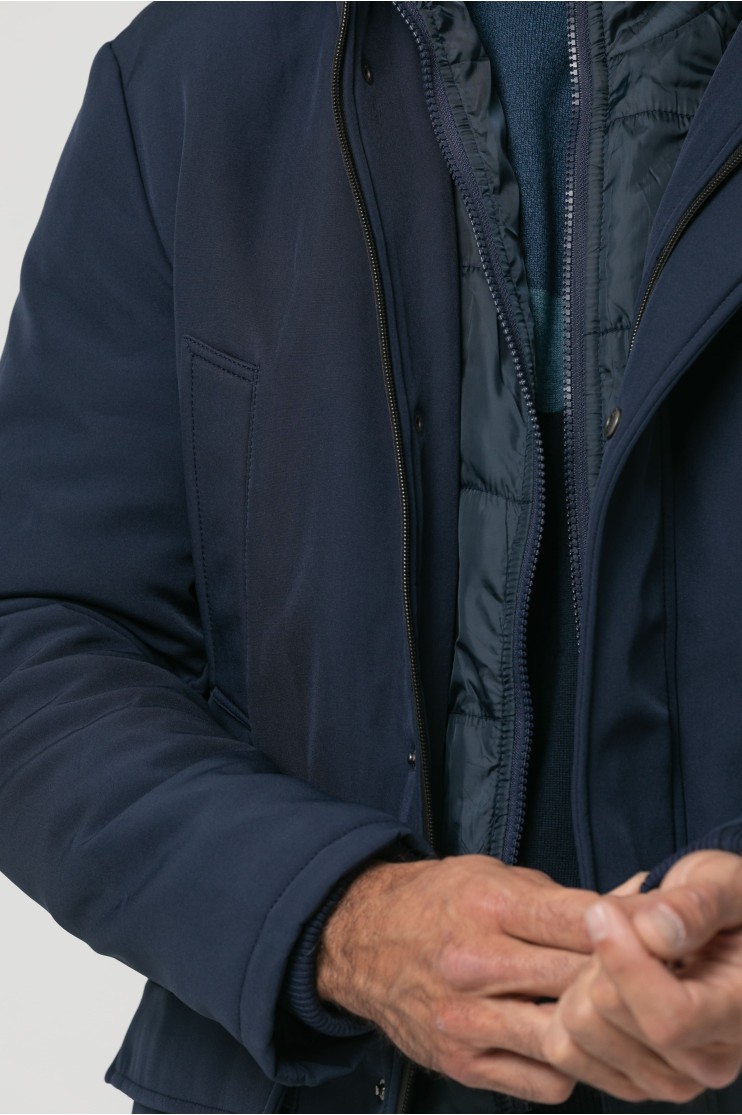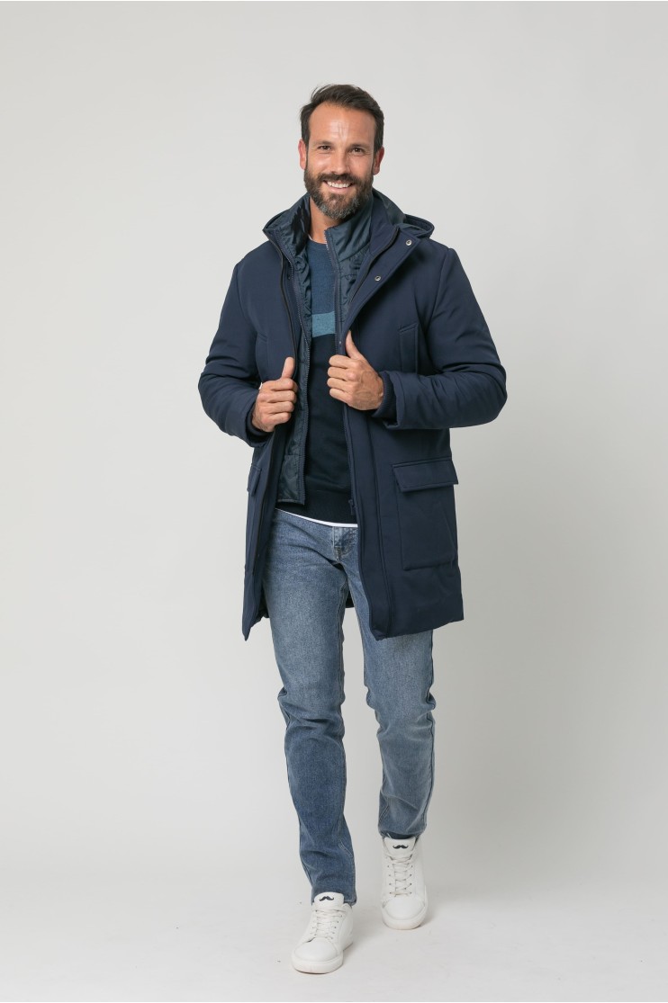 Parka repelente al agua con capucha extraíble y forro en contraste. Cuatro bolsillos delanteros y dos interiores. Se cierra mediante cremallera y pecherín de nylon en contrate y automáticos bajo tapeta.
