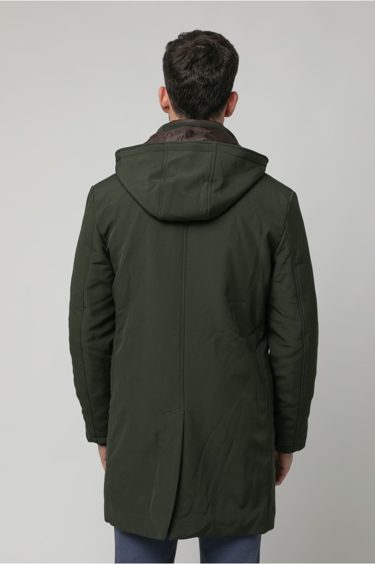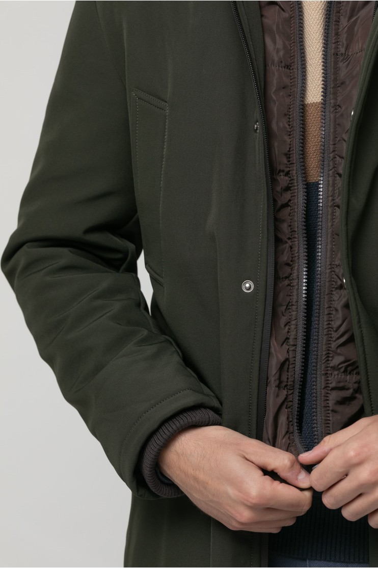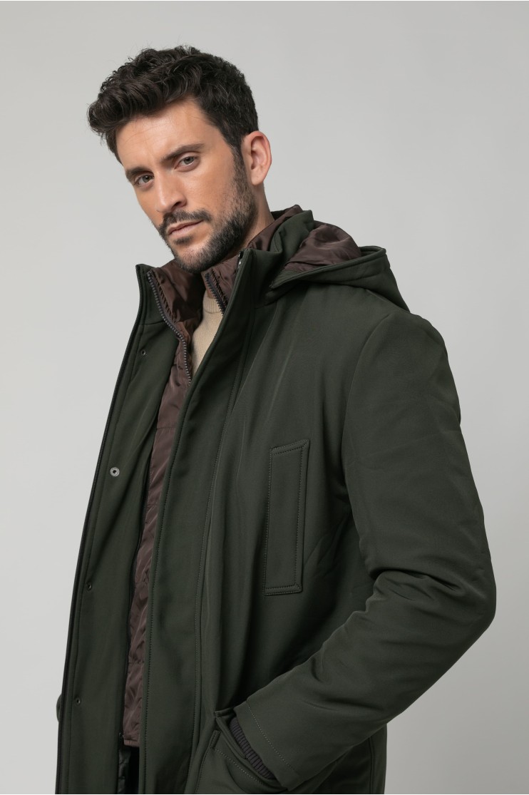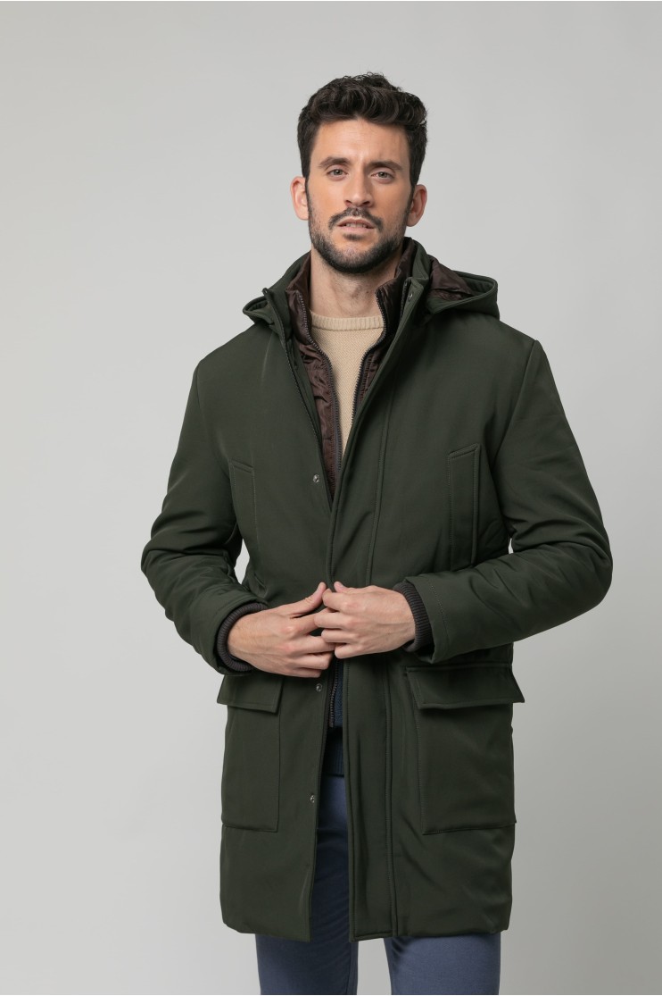 Parka repelente al agua con capucha extraíble y forro en contraste. Cuatro bolsillos delanteros y dos interiores. Se cierra mediante cremallera y pecherín de nylon en contrate y automáticos bajo tapeta.