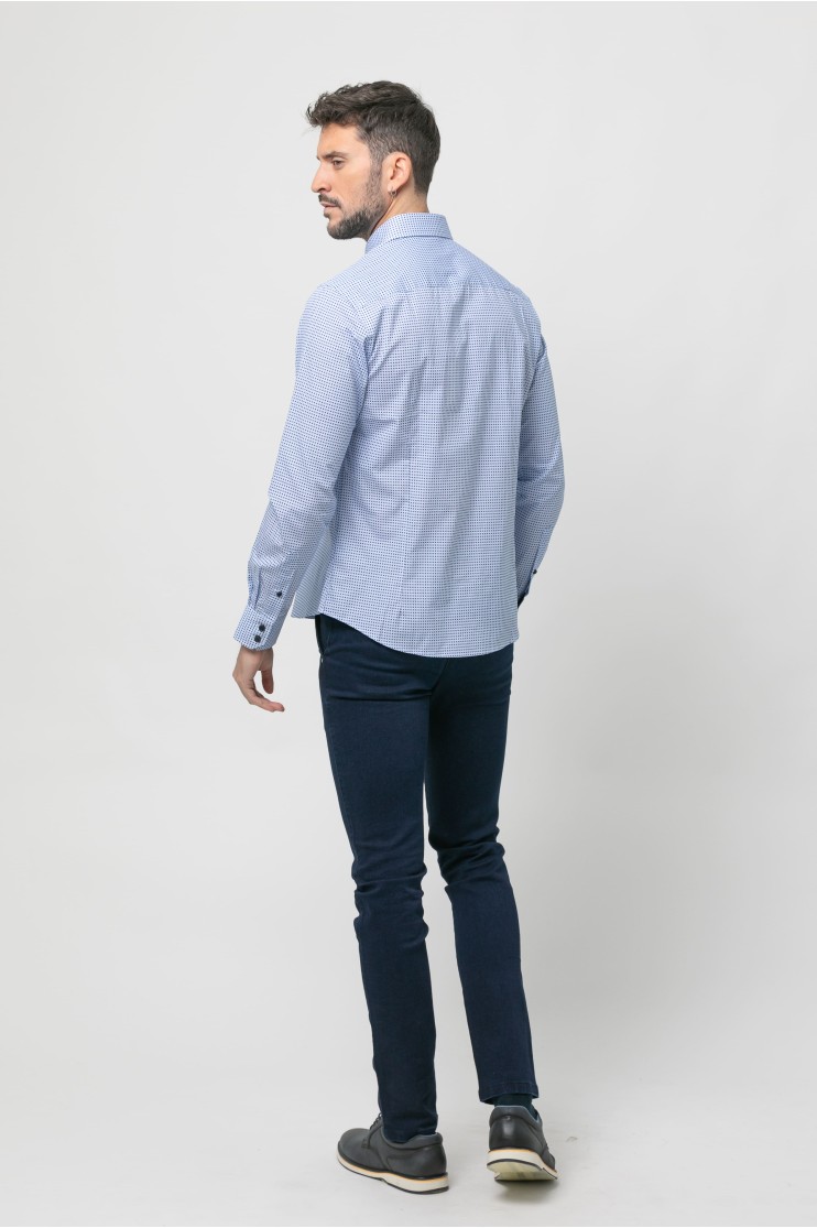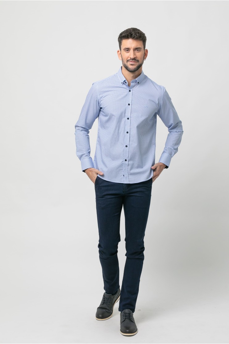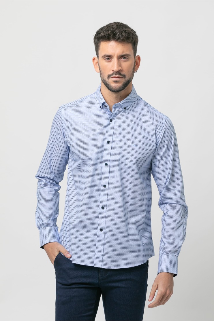 Tejido estampado, 100% algodón. Regular fit con pinzas en la espalda. Cuello vestir abotonado. Cierre delantero con botones en contraste en tapeta . Manga larga abotonada. Bajo redondeado. Bordado de la marca en el pecho