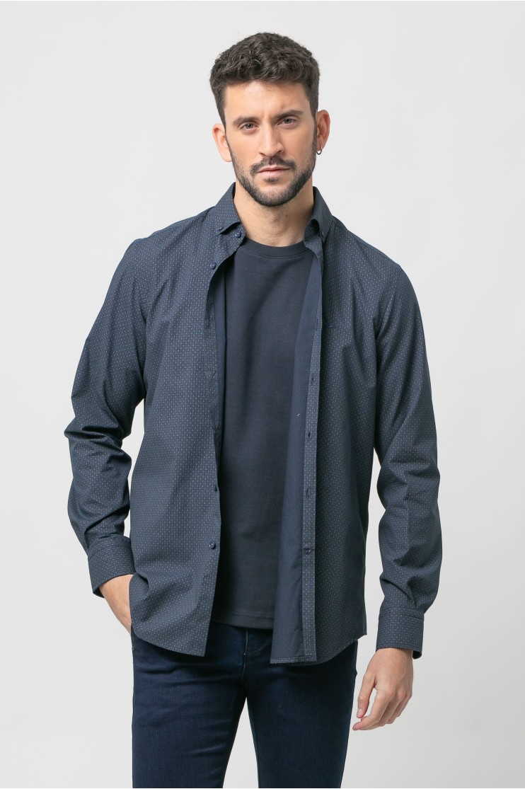 Tejido estampado, 100% algodón. Regular fit con pinzas en la espalda. Cuello vestir abotonado con detalle de vivo. Cierre delantero con botones en contraste en tapeta . Manga larga abotonada. Bajo redondeado. Bordado de la marca en el pecho.
