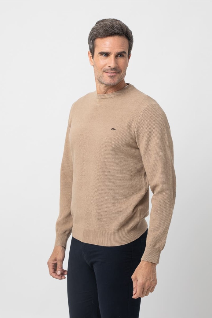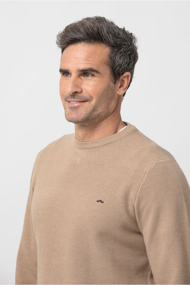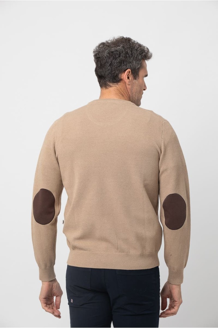 Jersey de punto, manga larga con coderas en contraste, cuello redondo y bajos terminados en rib. Logo de la marca marga bordado en el pecho al tono.