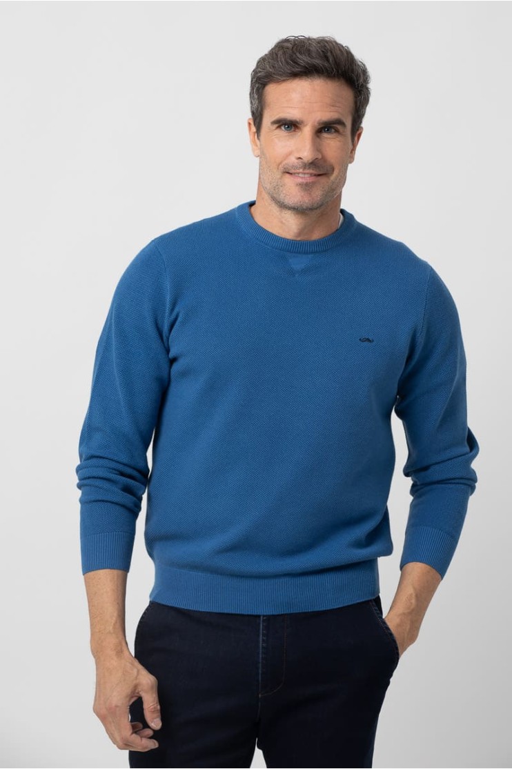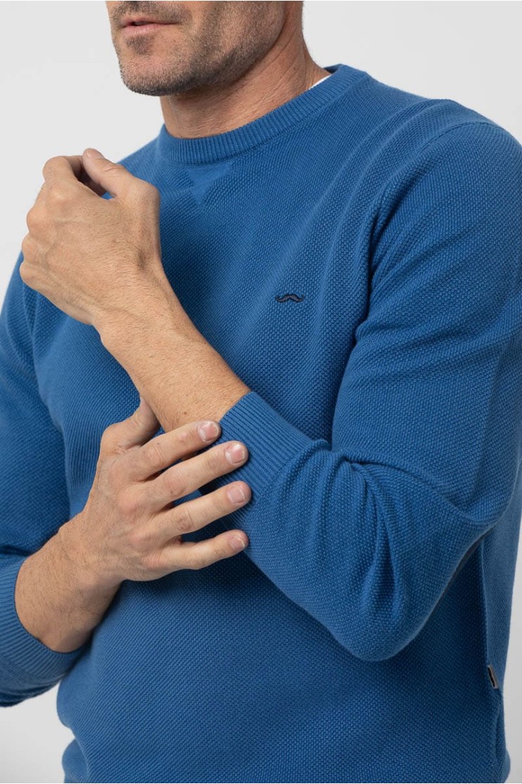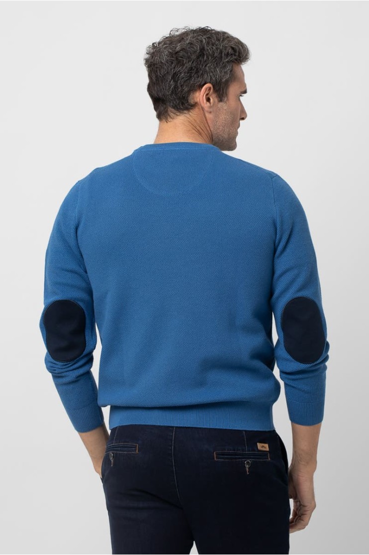 Jersey de punto, manga larga con coderas en contraste, cuello redondo y bajos terminados en rib. Logo de la marca marga bordado en el pecho al tono.