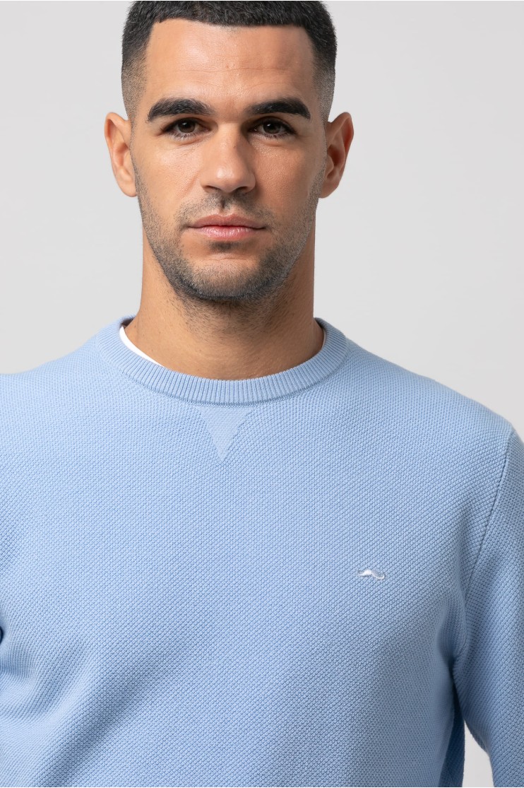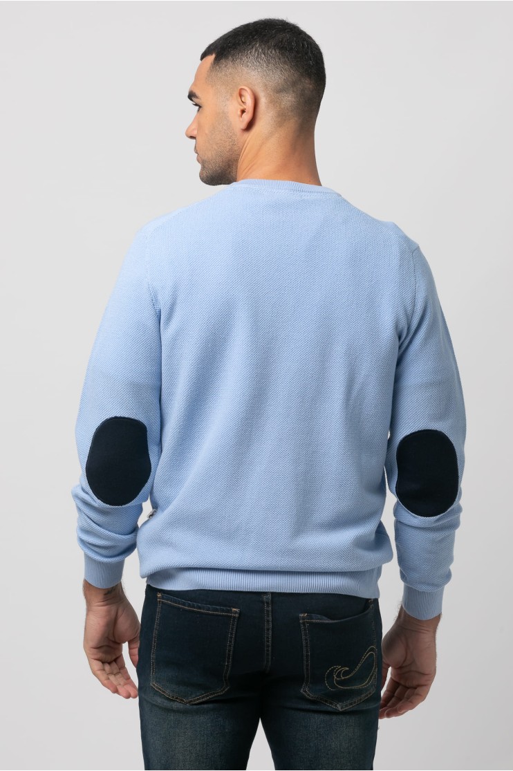 Jersey de punto, manga larga con coderas en contraste, cuello redondo y bajos terminados en rib. Logo de la marca marga bordado en el pecho al tono.