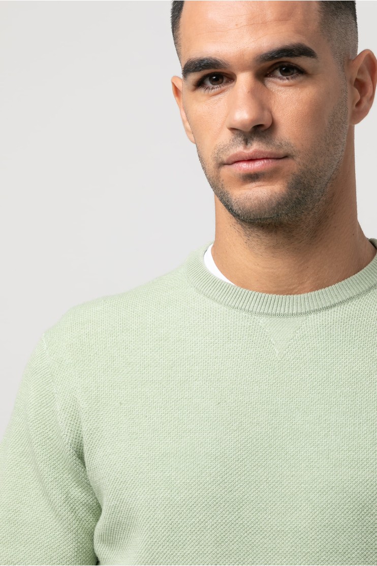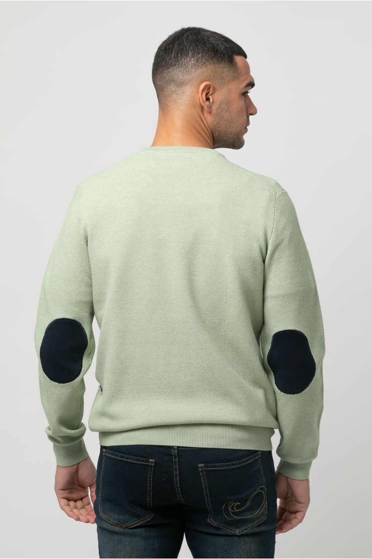 Jersey de punto, manga larga con coderas en contraste, cuello redondo y bajos terminados en rib. Logo de la marca marga bordado en el pecho al tono.