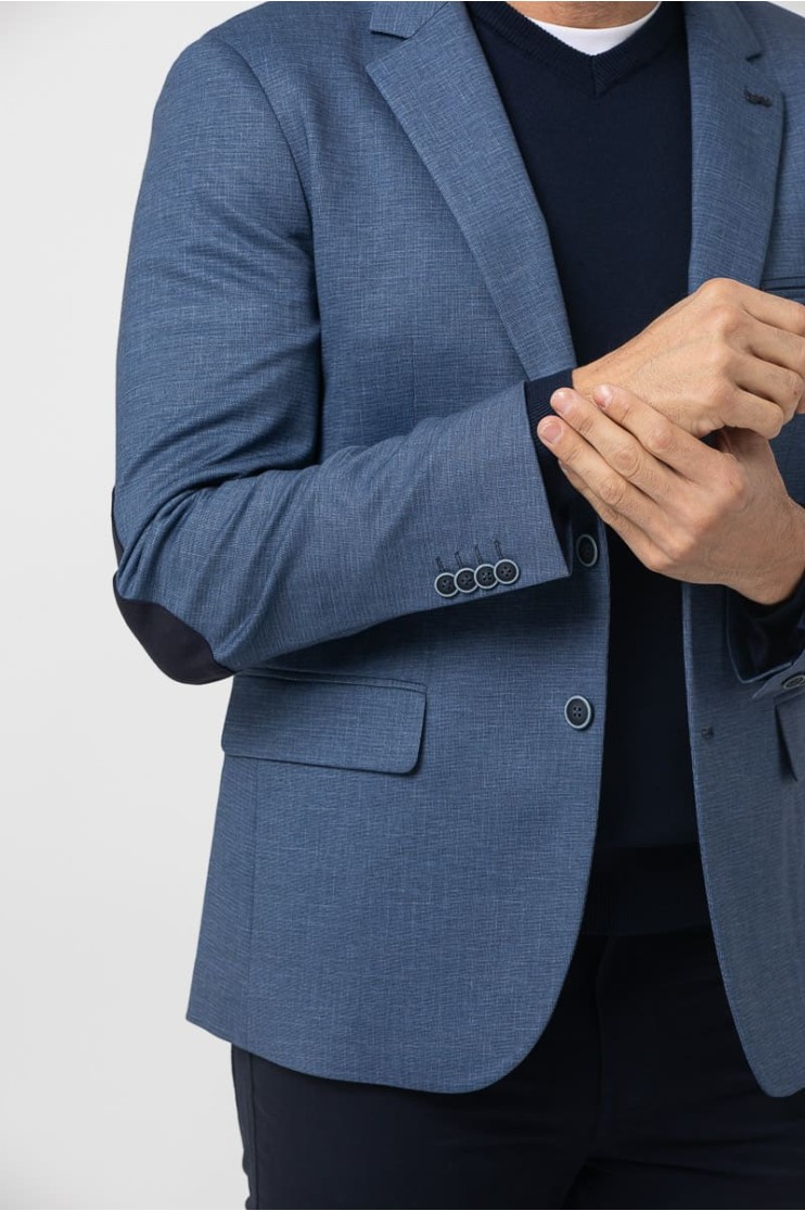 Americana de poliéster, viscosa y elastano de alta calidad y comodidad. La americana tiene bolsillos laterales, uno en el pecho con detalle, solapa de muesca, cierre de dos botones, manga larga con coderas y cuatro botones, una abertura trasera, forro de fantasía y bolsillos interiores.