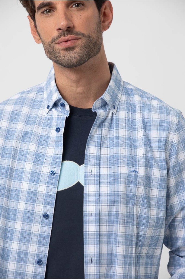 Camisa de cuadros 100% Algodón. Corte Slim que ensalzando la silueta masculina. Cuello botón, cierre mediante botonadura frontal en tapeta con botones cosidos en ancla, manga larga terminada en puño apto para gemelo, Bordado de la marca en el pecho en contraste.