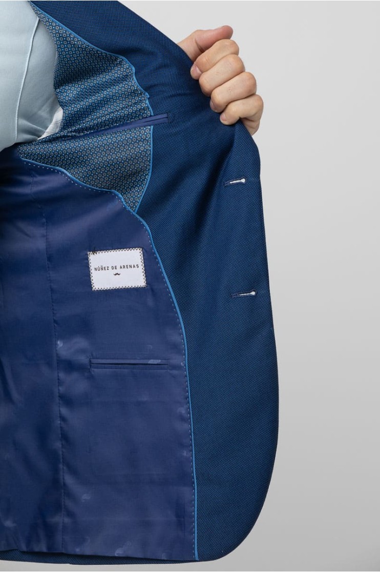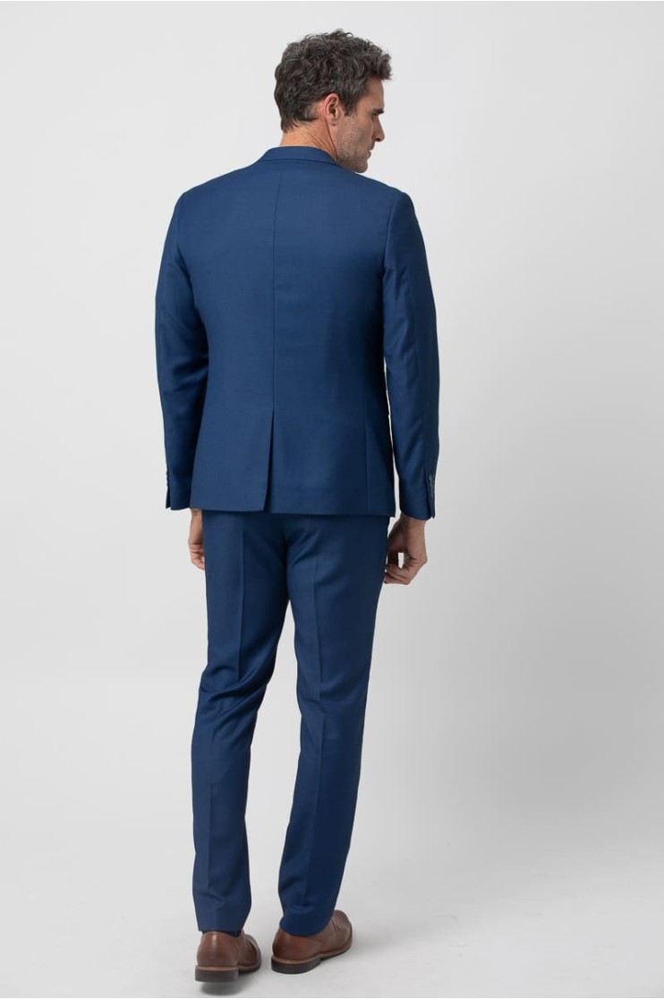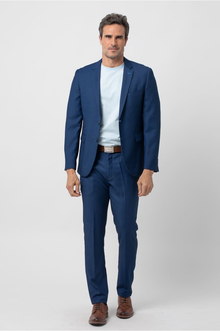 Traje confeccionado en tejido falso liso. Corte regular fit sin que sea muy entallado pero ensalzando la figura masculina, Americana con bolsillos de carterilla y otro de vivo y bolsillo a la altura del pecho, Solapa de muesca, ojal y pin de la marca en contraste. Cierre con dos botones. Manga larga rematada con cuatro botones. Dos aberturas en la parte posterior, forro y varios bolsillos interiores, Pantalón de vestir tejido falso liso con dos bolsillos laterales y otros dos bolsillos de vivo con botón en la parte posterior. Cinturilla con ensancha que hace ganar 1/2 talla, Cierre del pantalón con cremallera oculta por solapa y botón. Trabilla para cinturón y forro interior. Ancho de tobillo de 19 cms. Nuestros trajes son trabajado en un Drop Set de 6 tallas de diferencia entre la americana y pantalón. La talla del traje corresponde a la Americana.