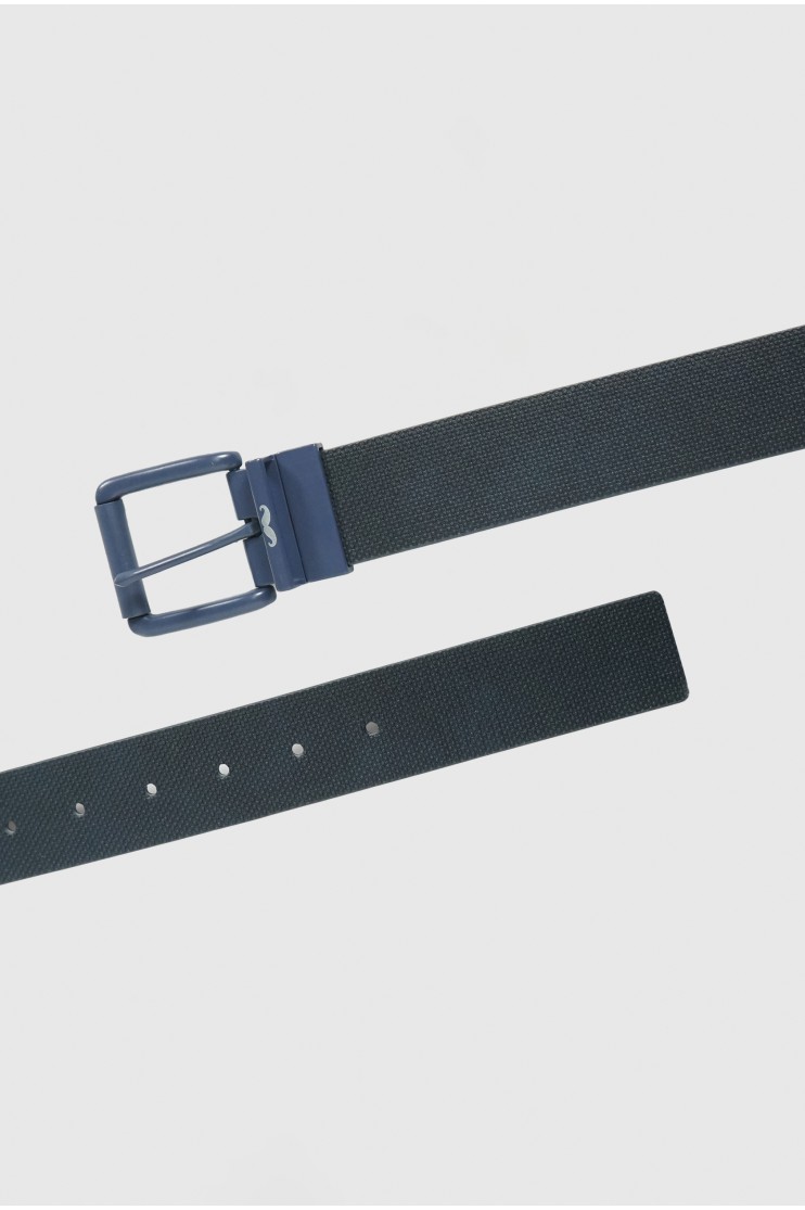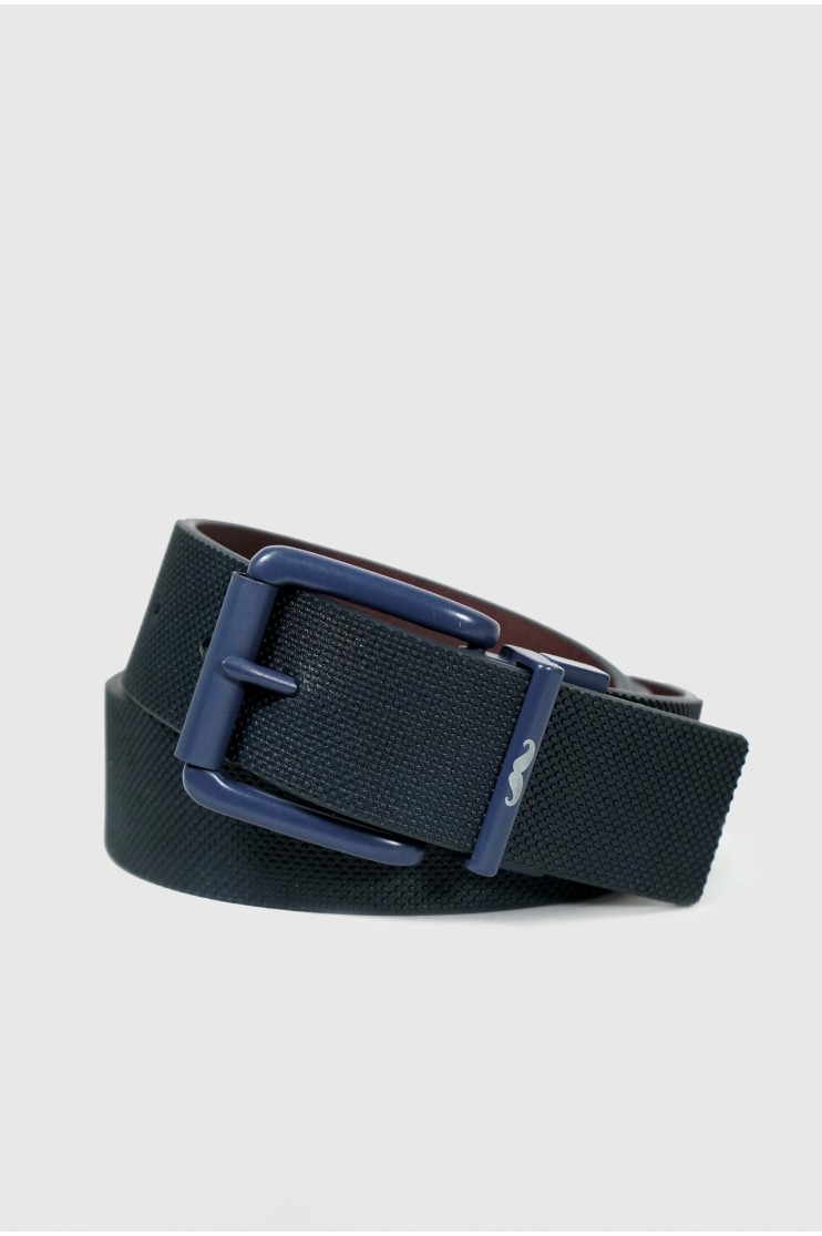 Cinturón reversible por una cara grabada en color negro y por la otra en color marrón. Girando la hebilla se puede lucir una piel u otra. Pasador con grabado discreto del bigote.