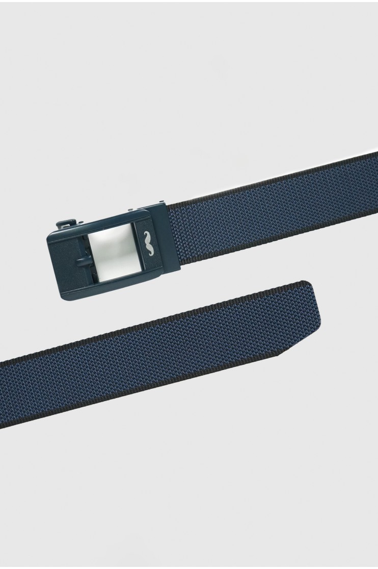 Cinturón reversible de goma. Girando la hebilla se puede lucir una piel u otra. Pasador con grabado discreto del bigote.