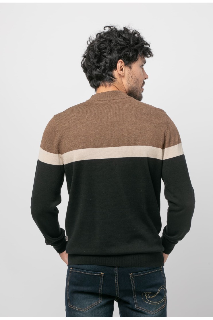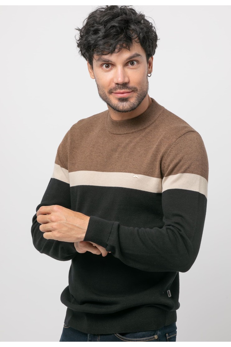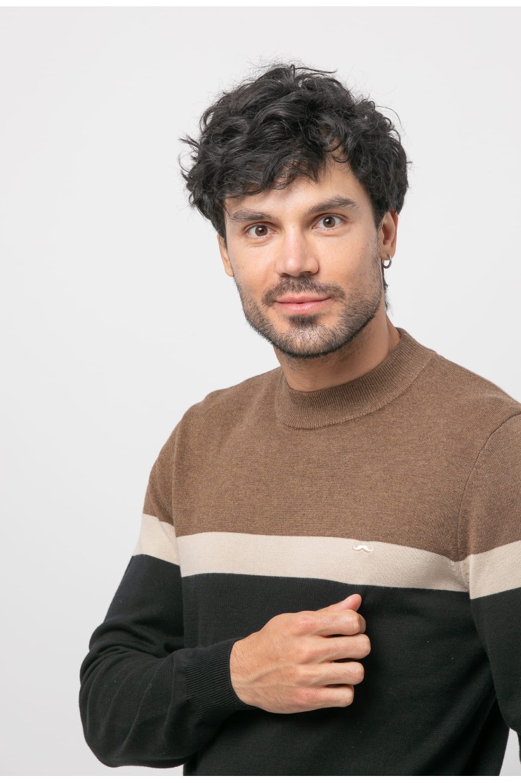 Jersey de liso de rayas combinadas en 100% algodón, corte recto, cuello subido , manga larga y acabados acanalados.