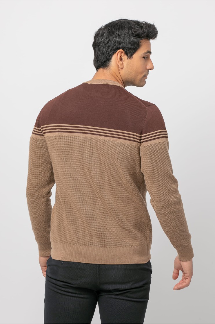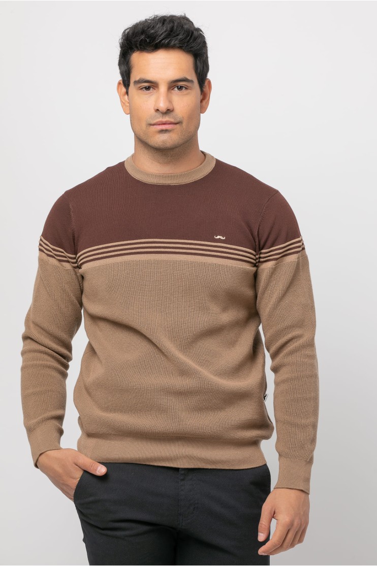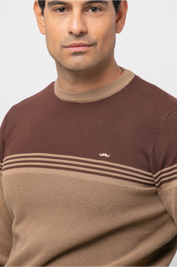 Jersey de estructura entrelazada tejido mezcla, corte recto, cuello redondo, manga larga y acabados acanalados. Colores combinados con rayas