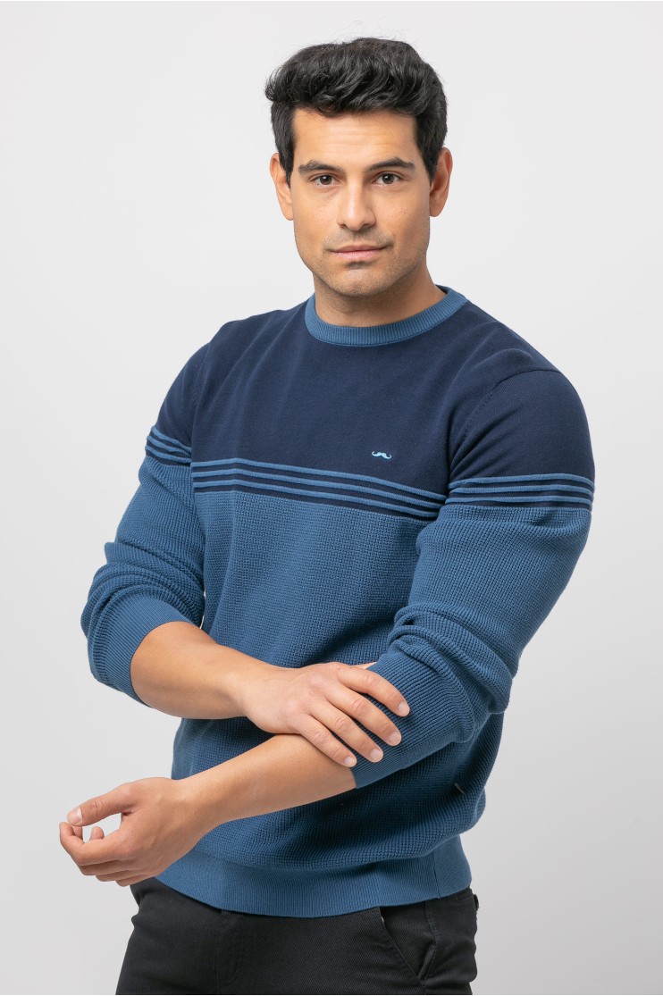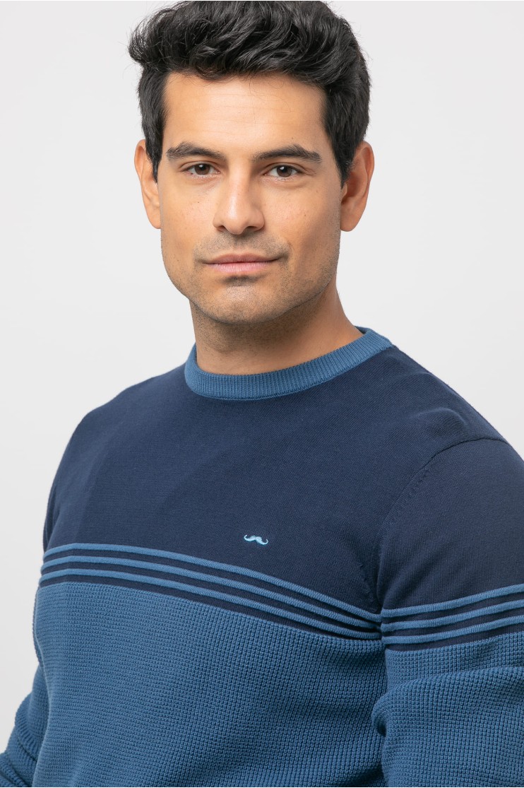 Jersey de estructura entrelazada tejido mezcla, corte recto, cuello redondo, manga larga y acabados acanalados. Colores combinados con rayas