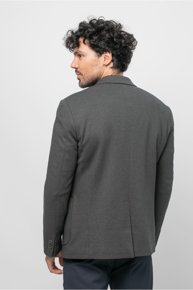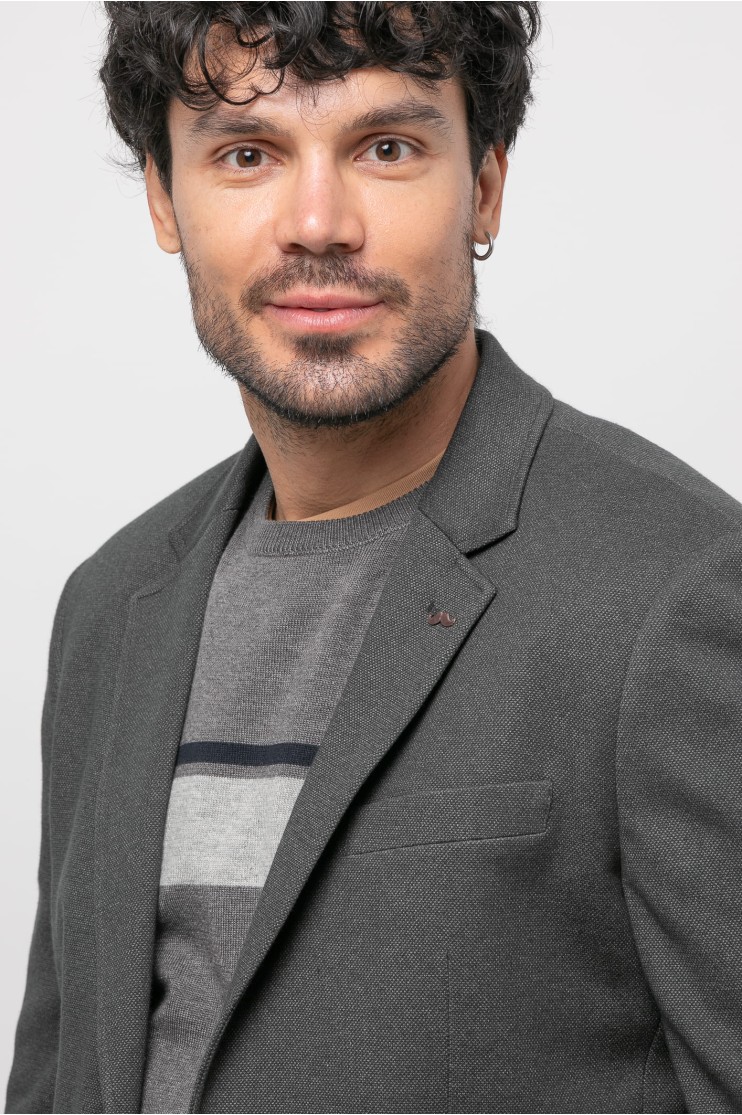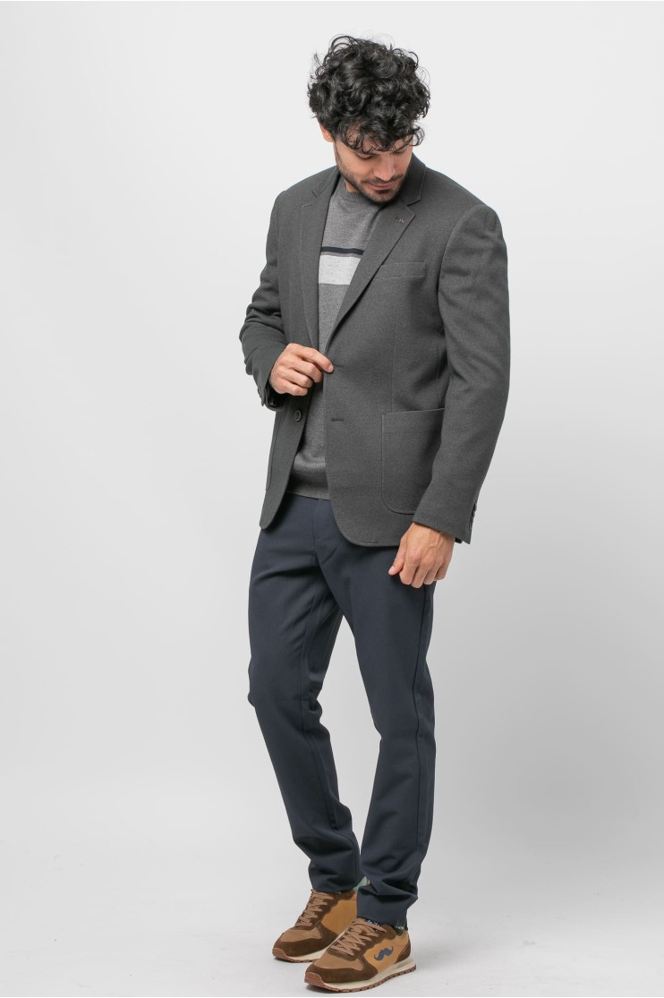 Americana sport corte regular con bolsillos laterales de tapeta, bolsillo a la altura del pecho con detalle. Solapa estándar o muesca y ojal y cierre con dos botones. Manga larga rematada con cuatro botones. Una abertura central en la parte posterior, forro y varios bolsillos interiores.