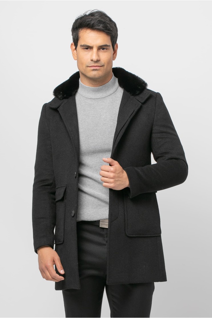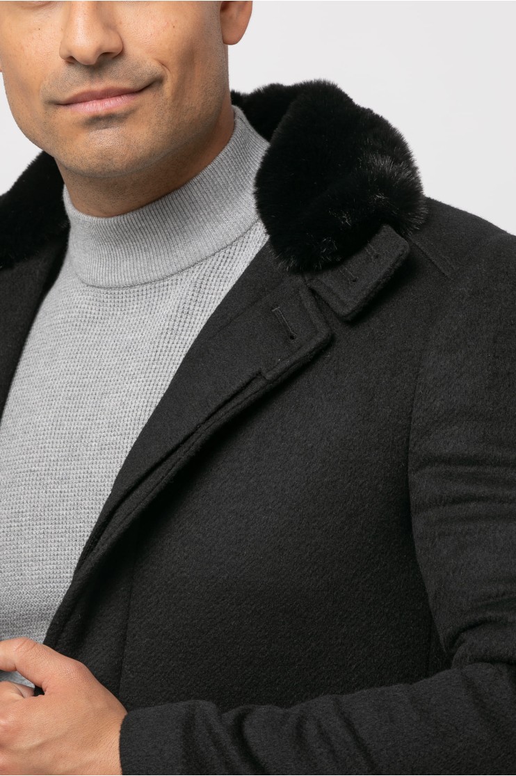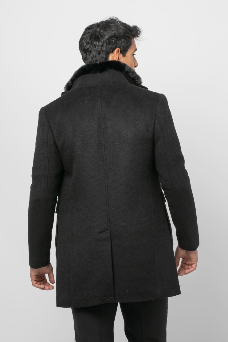 Abrigo con cuello subido cierre con botones e interior con pelo, manga larga con botones, bolsillos frontales e interiores, abertura central trasera y cierre frontal con tapeta y botones.