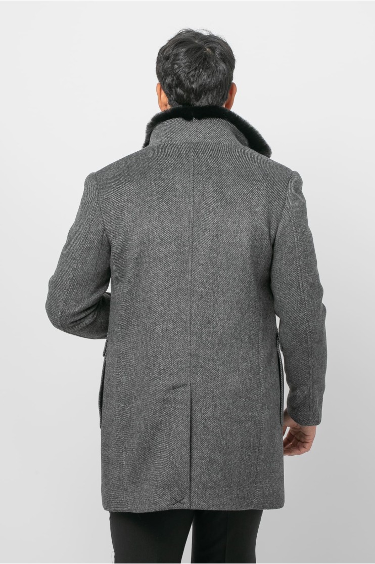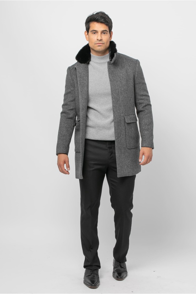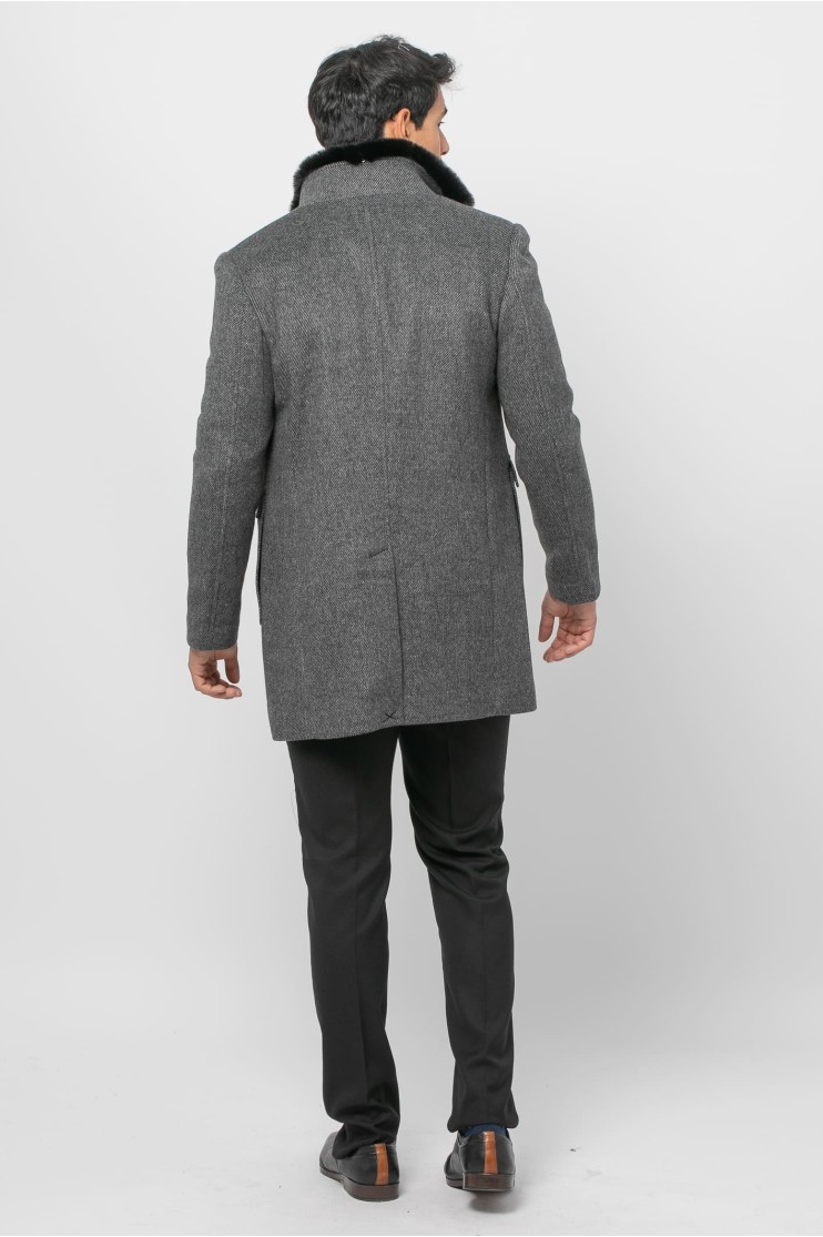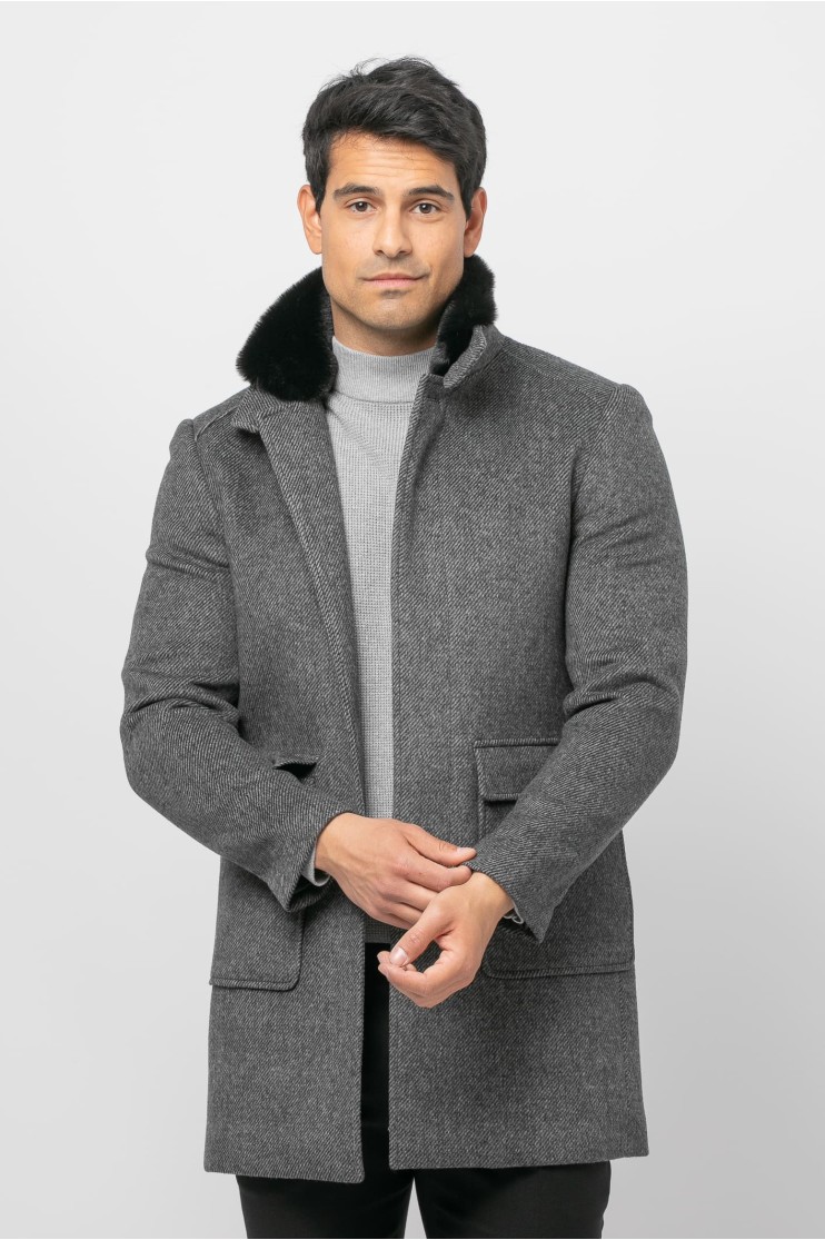 Abrigo con cuello subido cierre con botones e interior con pelo, manga larga con botones, bolsillos frontales e interiores, abertura central trasera y cierre frontal con tapeta y botones.