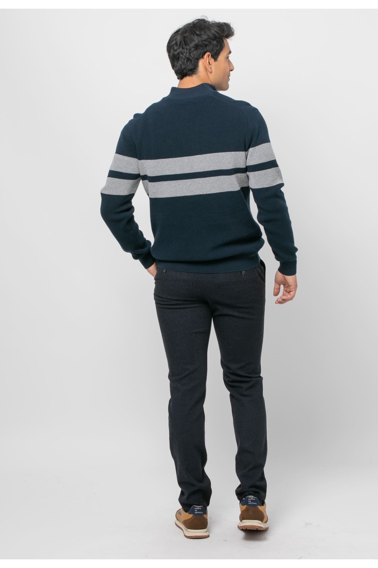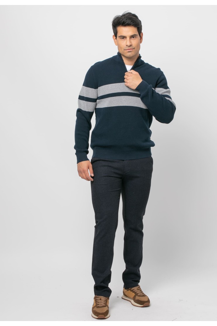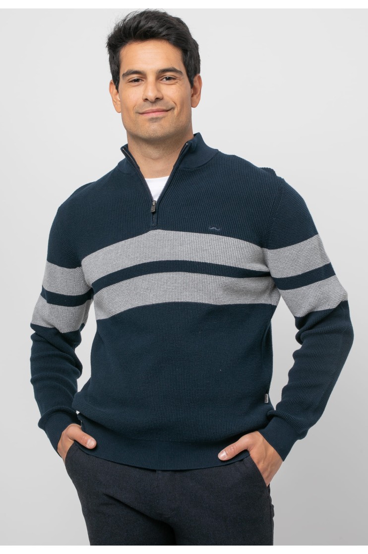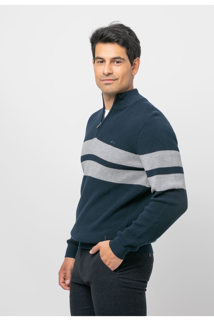Jersey de estructura en 100% algodón con dos rayas en contraste, corte recto, cuello media cremallera, manga larga y acabados acanalados.