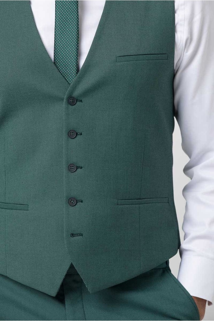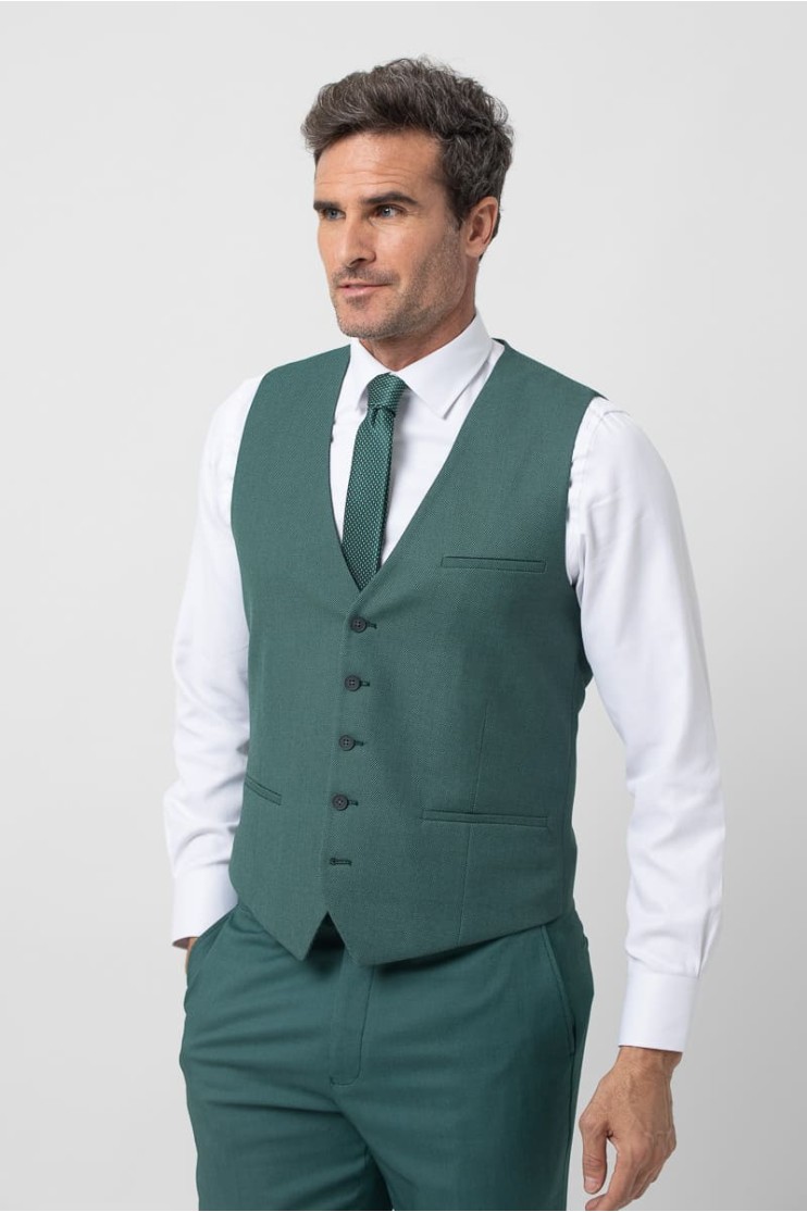 Chaleco de traje en tejido elástico. Presenta cuello pico, cierre mediante botonadura frontal, dos bolsillos de vivo, banda ajustable por botones en la parte posterior y forro interior de fantasía. Combínalo con la americana España Ref. 2511406001 y el pantalón España Ref. 2510113001, para completar el traje de tres piezas.