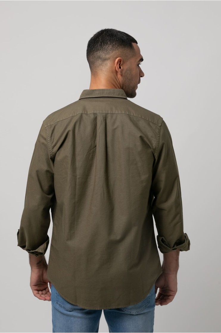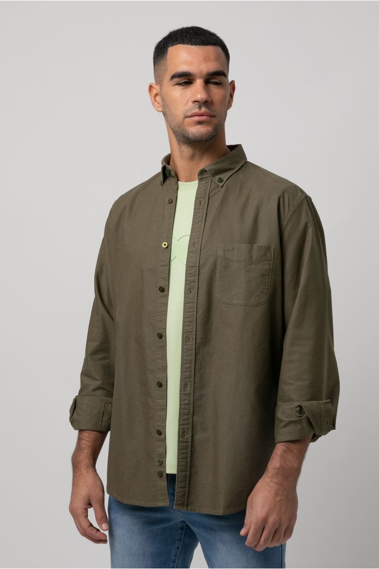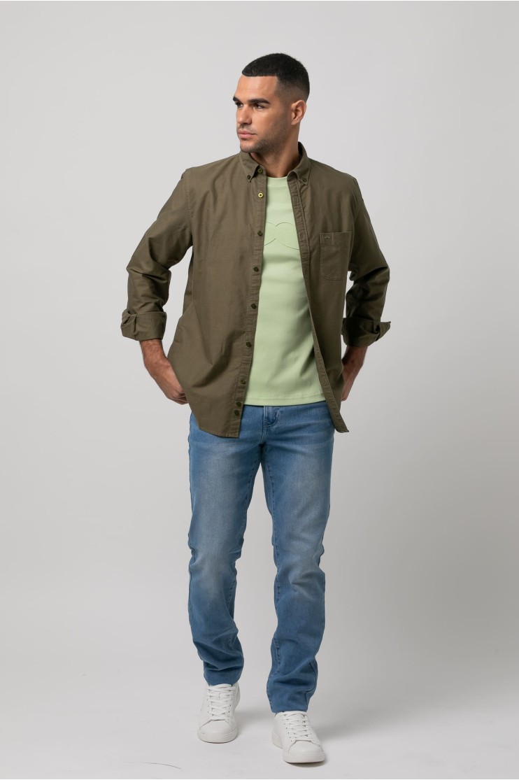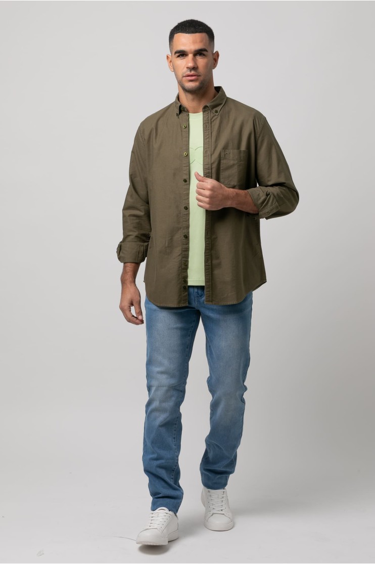 Camisa 100% algodón, lavado sport. Slim fit con pinzas en la espalda, cuello botón, cierre frontal de botones en tapeta, manga larga con puños abotonados y bordado de la marca al tono en el bolsillo del pecho.