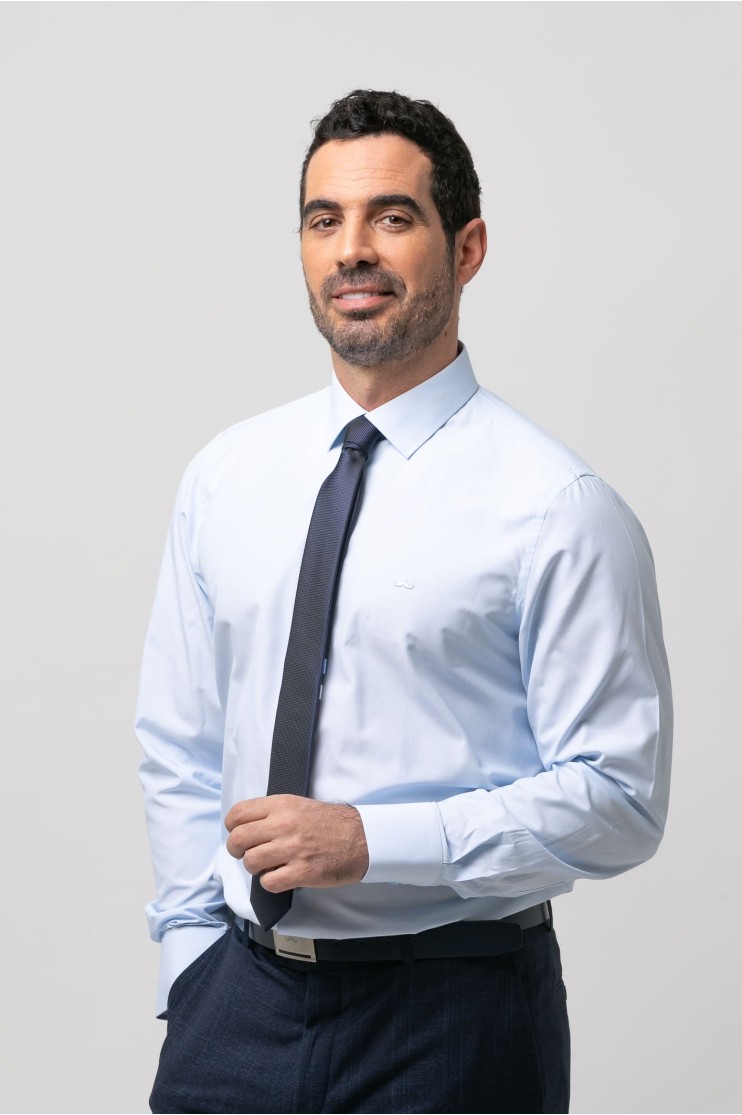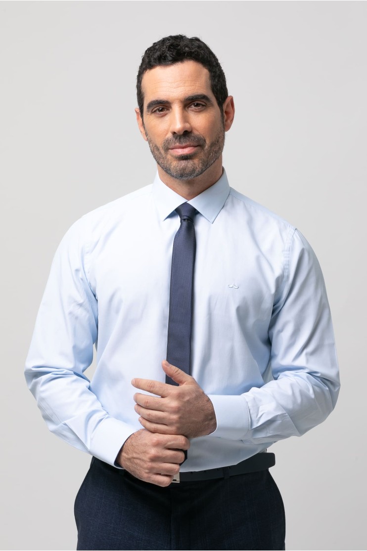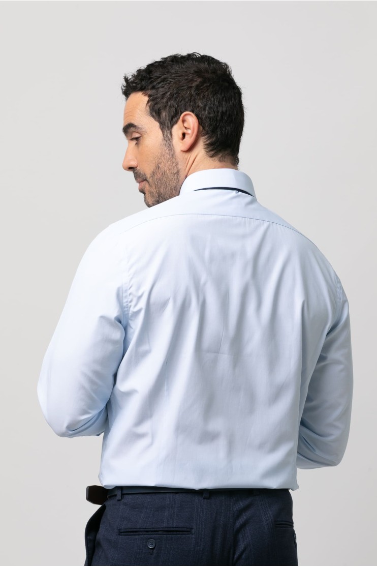 Camisa de vestir falso liso. Slim fit con pinzas en la espalda, cuello clásico, cierre frontal de botones, manga larga con puños abotonados aptos para gemelo y bordado de la marca en el pecho al tono.