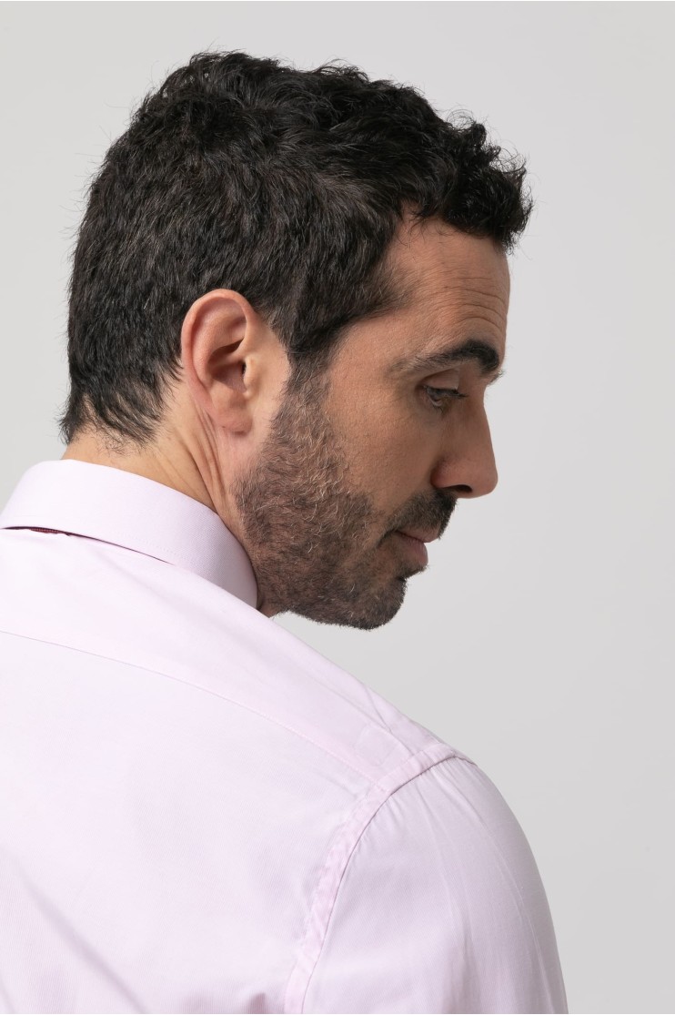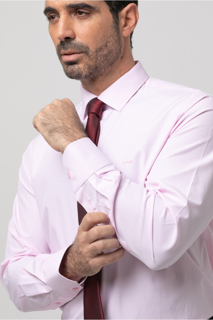 Camisa de vestir falso liso. Slim fit con pinzas en la espalda, cuello clásico, cierre frontal de botones, manga larga con puños abotonados aptos para gemelo y bordado de la marca en el pecho al tono.