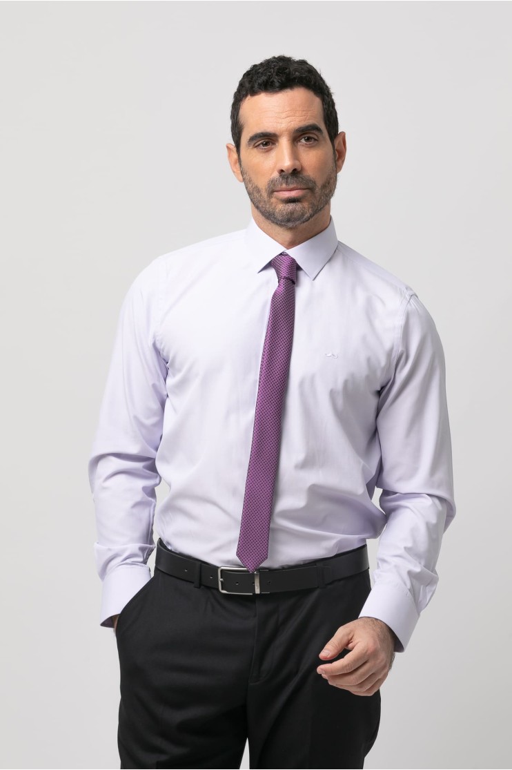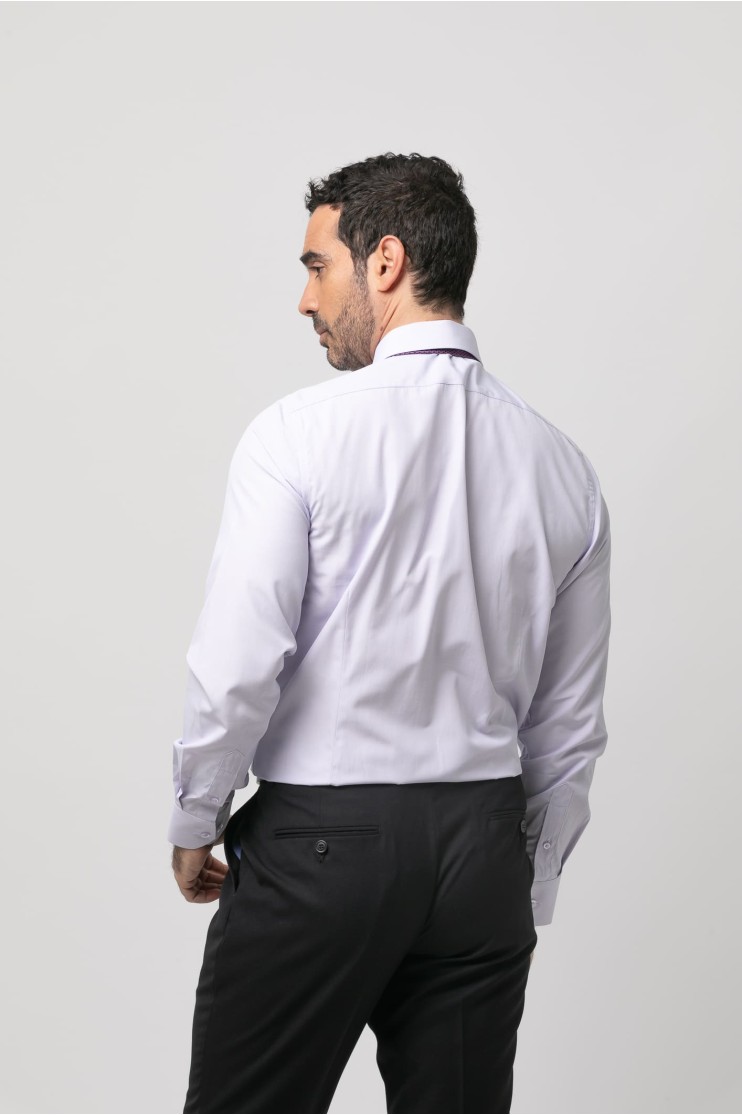 Camisa de vestir falso liso. Slim fit con pinzas en la espalda, cuello clásico, cierre frontal de botones, manga larga con puños abotonados aptos para gemelo y bordado de la marca en el pecho al tono.