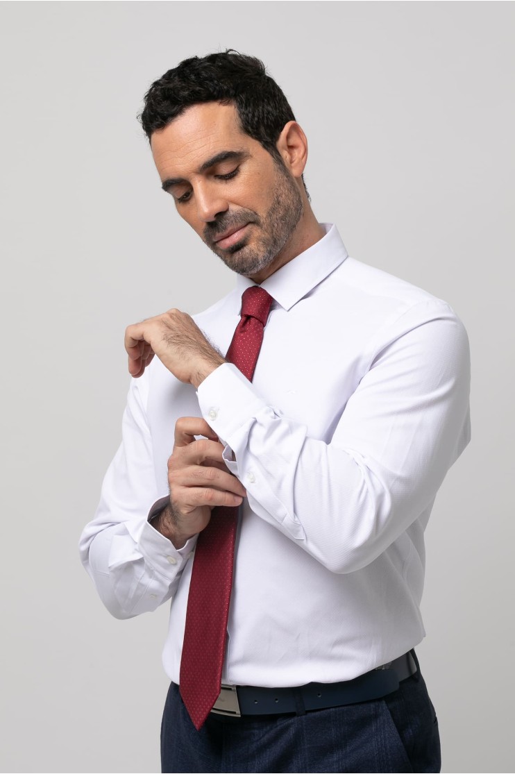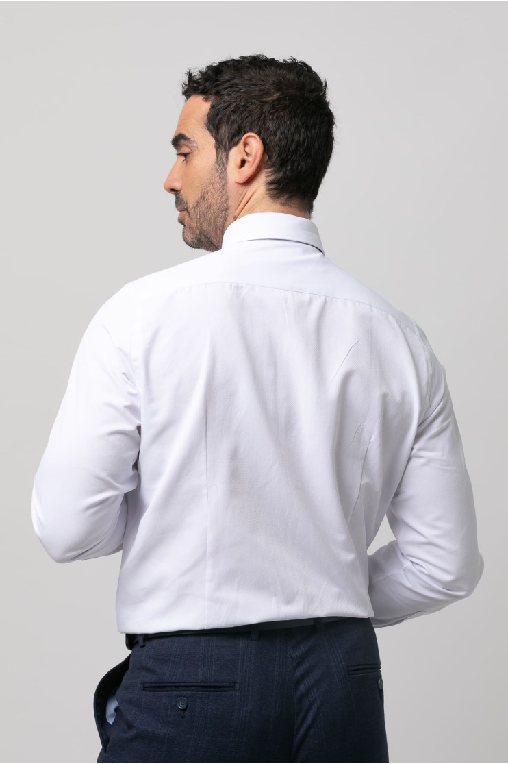 Camisa de vestir falso liso, Slim fit con pinzas en la espalda. Cuello clásico, cierre frontal de botones en tapeta, manga larga con puños abotonados aptos para gemelo y bordado de la marca en el pecho al tono.