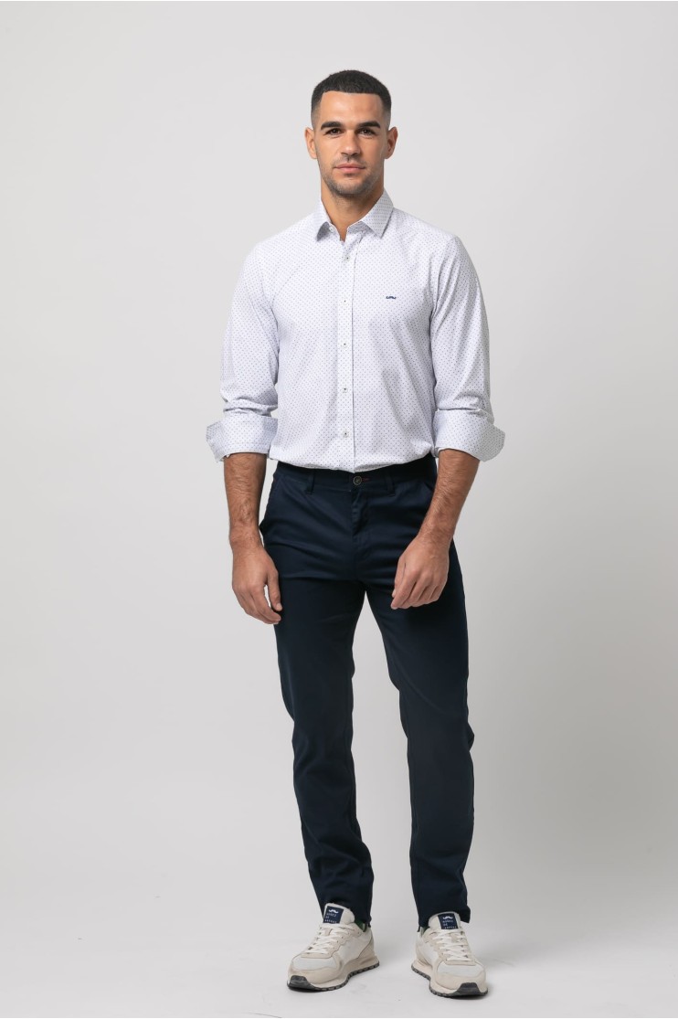 Pantalón Slim fit con algodón, tejido estructura, cierre de cremallera oculta y botón. Dos bolsillos laterales, dos traseros abotonados, trabillas para cinturón y forro interior.