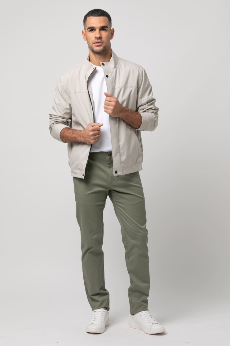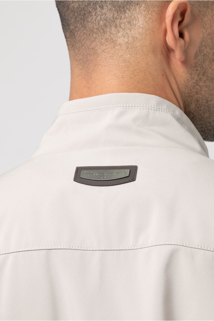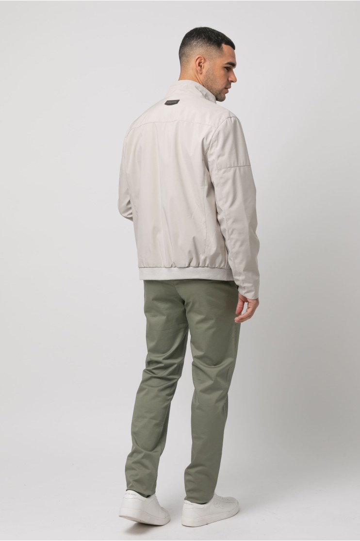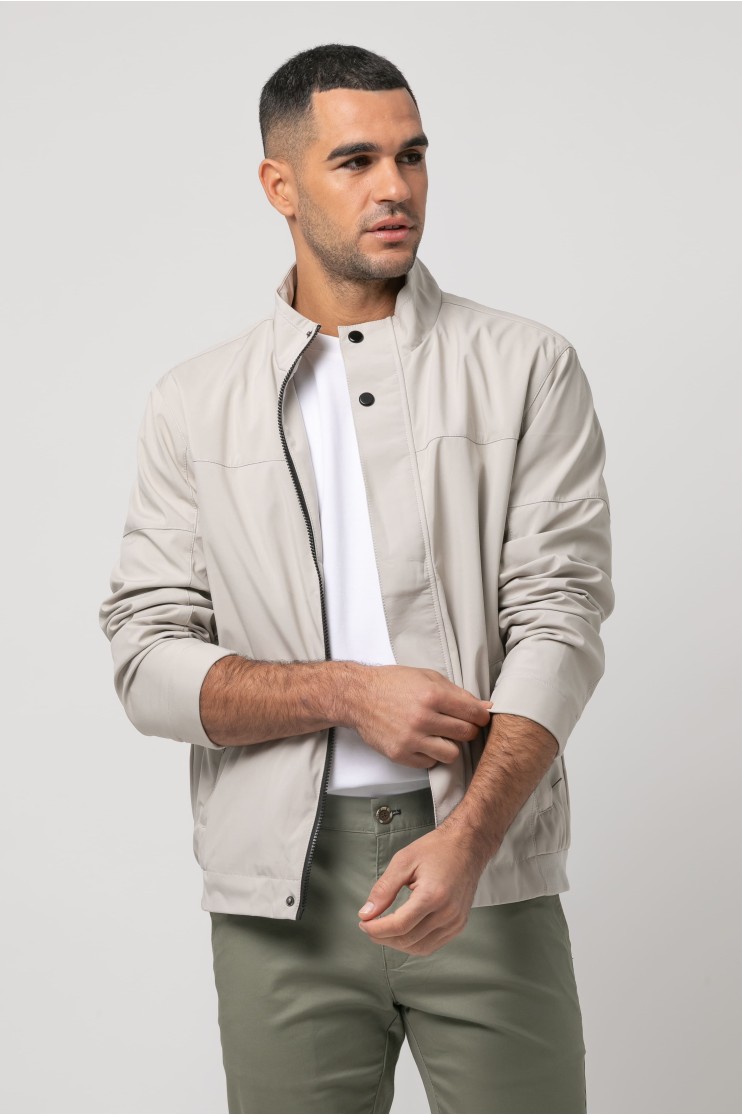 Cazadora en tejido técnico con dos bolsillos frontales que cierran con cremallera. Bajo con goma. Cierre en tapeta con cremallera y automáticos.